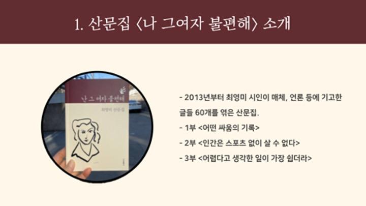 <난 그 여자 불편해>는 최영미 시인이 그동안 언론, 미디어 등에 기고해왔던 글들을 엮어 낸 책입니다. 이 책을 내기까지 시인님은 많은 고민을 하셨다고 하는데요, 더 이상 가해자가 자신의 삶에 침투해 있는 것이 싫어 출간을 주저하다 주변의 지지와 요청으로 출간을 결정하였다고 하셨습니다. 오랜 시간 시인의 삶을 담은 글들을 모은 만큼, 이 책에서는 다양한 주제들을 다루고 있는데요. 이 날 북토크에서는 총 8가지 주제로 나누어 행사가 진행되었습니다. 시인으로서의 삶, 미투 이후의 재판 과정, 스포츠와 집에 대한 애정 등 삶 전반에 대한 다양한 이야기를 들을 수 있었습니다.