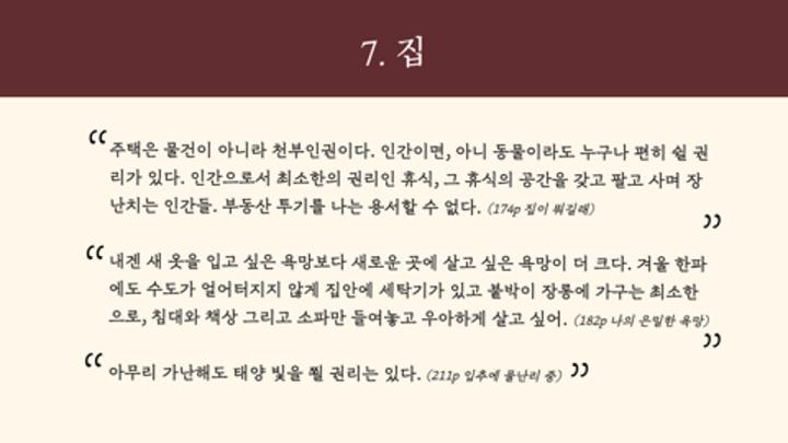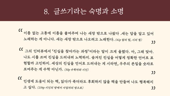 최영미 시인에게 글쓰기란 ‘진실을 찾아가는 과정’이었습니다. 문단 내 만연한 가부장적 문화를 폭로한 것도, 고은의 성폭력을 고발하는 것도 모두 시를 통해서 였습니다. 또한 시인의 일상을 담은 글에는 한국 사회에서 여성이 받는 시선, 차별 등이 고스란히 녹아져 있습니다. 페미니스트로서의 저항을 잃지 않으면서도 스포츠, 우정 등 자신의 일상, 기쁨을 잃지 않으려 했던 시인의 모습, 그러면서도 ‘글’을 통해 한국 사회의 민낯을 담고자 했던 최영미 시인의 삶을 읽고 이야기 나누며 ‘나는 어떻게 살아갈 것이며 또 나는 무엇을 할 것인가’에 대해 많은 고민을 하며 답에 다가갈 수 있었습니다.