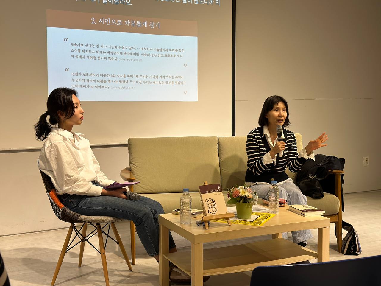 한편 미혼 여성으로 살아가는 것에 대한 시인님의 이야기도 인상깊었습니다. 미혼으로서의 자신의 삶에 만족하고 충분함에도, 미혼이라는 이유로 주위 사람들로부터 부족한 사람, 미성숙한 사람이라는 인식을 받아야 했다고 말씀하셨는데요. “결혼하지 않으면 귀찮아진다”라는 시인의 말에 청중들은 공감의 웃음을 내기도 하였습니다. 여전히 결혼이 정상인 사회에서 특히 미혼의 여성으로 살아가는 것이 결코 쉽지 않음을 한번 더 느꼈습니다.