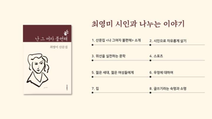 <난 그 여자 불편해>는 최영미 시인이 그동안 언론, 미디어 등에 기고해왔던 글들을 엮어 낸 책입니다. 이 책을 내기까지 시인님은 많은 고민을 하셨다고 하는데요, 더 이상 가해자가 자신의 삶에 침투해 있는 것이 싫어 출간을 주저하다 주변의 지지와 요청으로 출간을 결정하였다고 하셨습니다. 오랜 시간 시인의 삶을 담은 글들을 모은 만큼, 이 책에서는 다양한 주제들을 다루고 있는데요. 이 날 북토크에서는 총 8가지 주제로 나누어 행사가 진행되었습니다. 시인으로서의 삶, 미투 이후의 재판 과정, 스포츠와 집에 대한 애정 등 삶 전반에 대한 다양한 이야기를 들을 수 있었습니다.