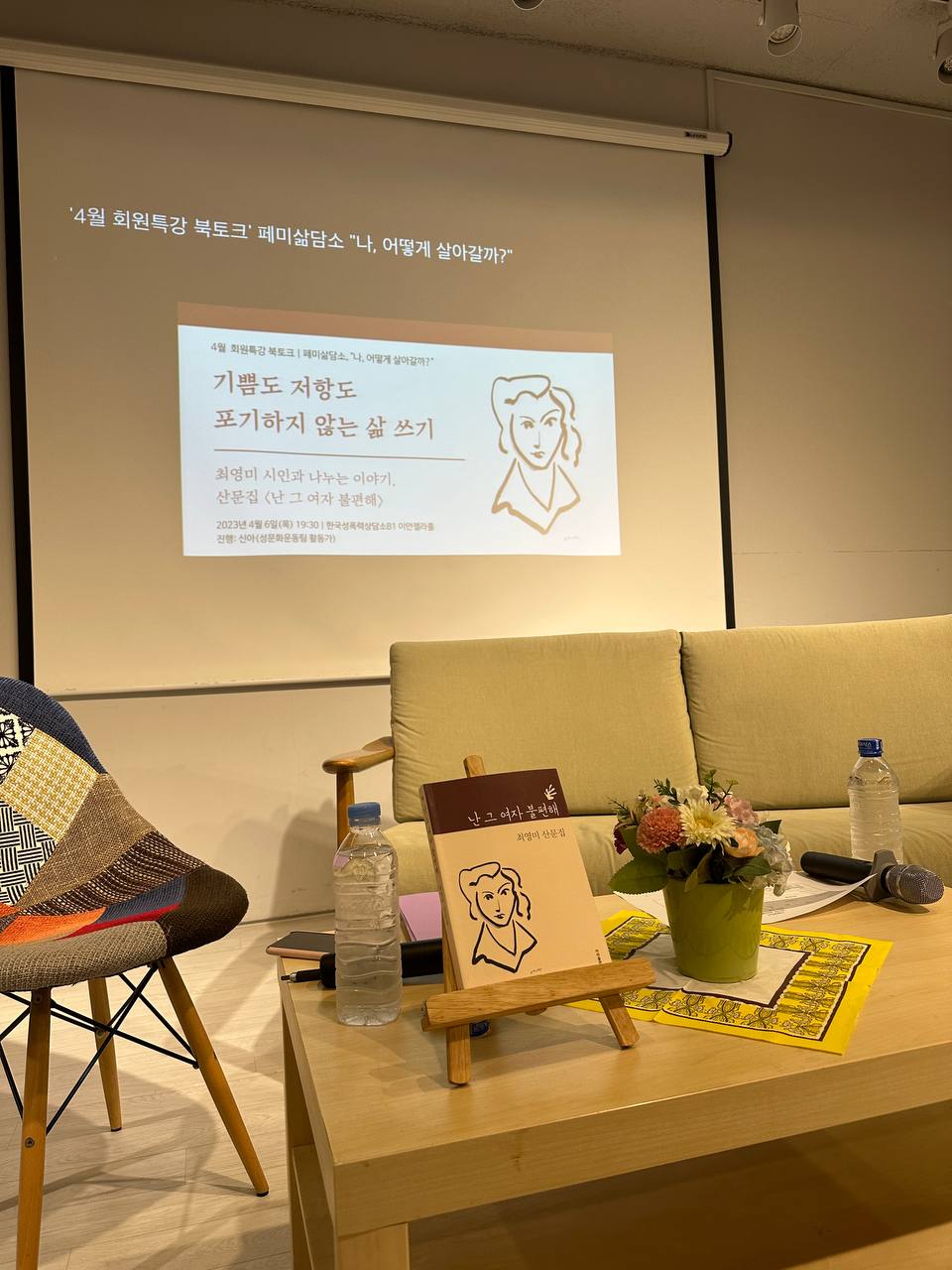 회원특강 북토크 페미삶담소 “나, 어떻게 살아갈까”의 첫번째 시간인 최영미 시인과의 북토크에서는 페미니스트로 살아가며 저항과 기쁨을 모두 잃지 않으려 했던 최영미 시인의 이야기를 들으며, ‘나는 어떻게 살아갈 것인가’에 대한 답에 조금씩 다가갈 수 있었습니다. 한 여성의 삶에 대해 읽고 이야기 나누며 공감도 하고 위로도 받을 수 있었던 시간이었던 최영미 시인의 <난 그 여자 불편해>의 북토크 현장으로 초대합니다.