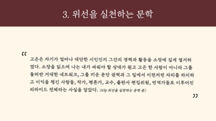 최영미 시인은 끝까지 싸워 승소하였는데요, 끝까지 싸울 수 있었던 원동력에 대해 시인은 다음 세대의 여성들을 생각했기 때문이라 말씀하셨습니다. 자신이 끝까지 싸워서, 결국 이겨냈음을 여성들에게, 사람들에게 알려야 한다고 생각하셨다고 합니다. 미투 이후 한 공동체에서 오히려 미투 당사자가, 피해자가 더 외면 받는 우리 사회에서 시인님이 끝까지 싸우며 절대 굴하지 않았던 모습에서 많은 힘을 얻고 저항에 대한 동력을 얻을 수 있었습니다.