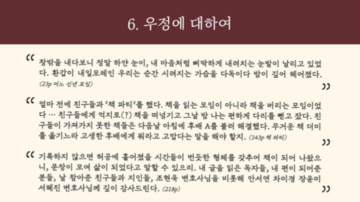 물론 최영미 시인 역시 재판을 진행하는 과정은 힘겨웠다고 이야기하셨습니다. 증거를 하나 하나수집하고 재판을 처음부터 끝까지 참여하는 과정은 힘든 일이죠. 또한, 문단 동료들로부터 자신을 향한 외면을 느끼기도 하였다고 전했습니다. 오히려 시인께서는 단골 식당에서 자신에게 반찬을 더 주는 사장님의 모습을 보며, “식당 사장님도 나를 응원하는데 재판에서 질 리가 있나” 생각하셨다고 합니다.