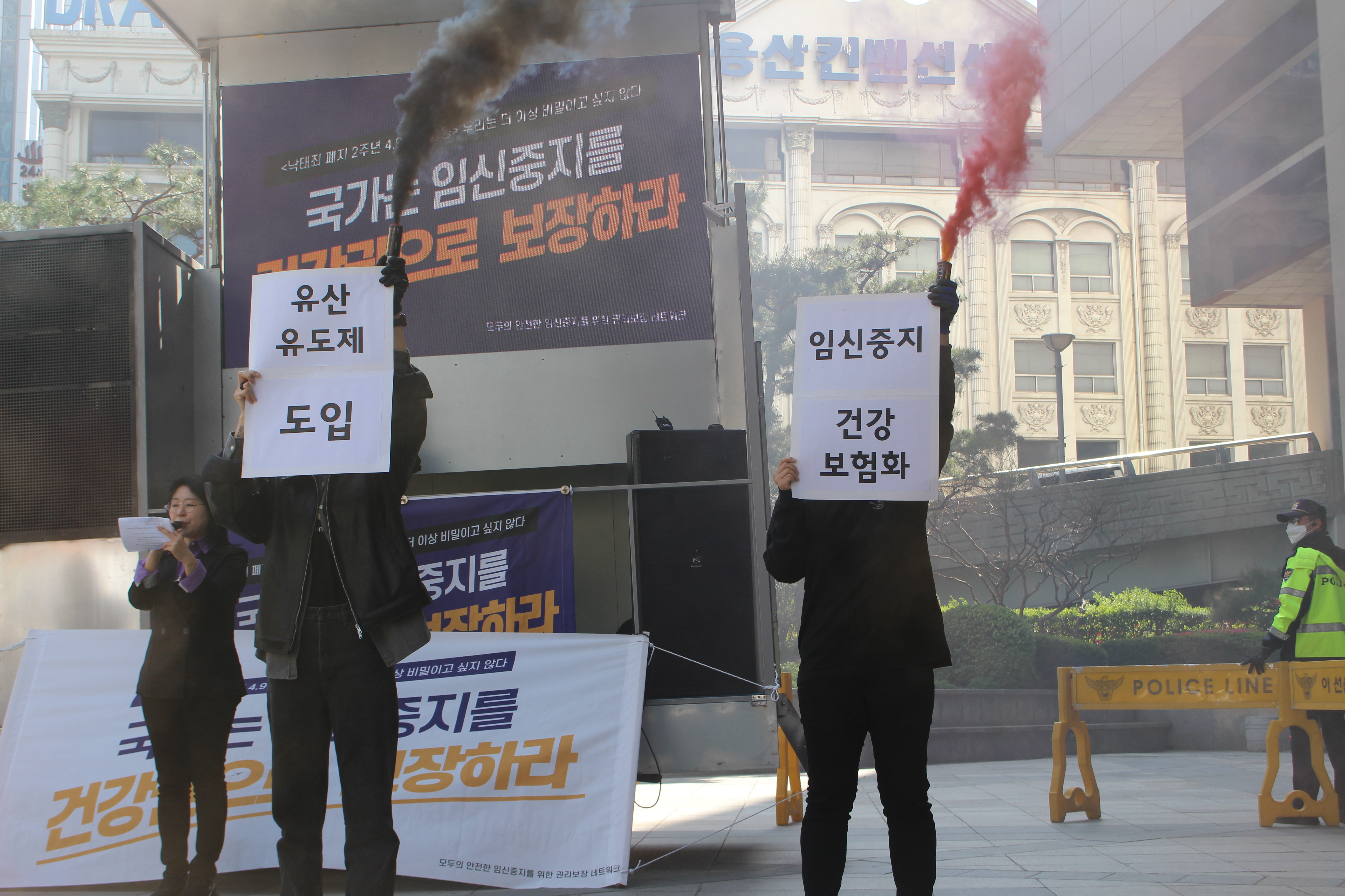 집회 마무리로는 색색깔의 연기 퍼포먼스가 진행되었습니다. 집회 참여자들은 "건강보험 전면 적용", "유산유도제 도입", "보건의료 체계 구축", "종합 정보 제공 시스템 마련", "임신중지 권리 보장 교육 실행", "사회적 낙인 해소 및 포괄적 성교육 시행", "성·재생산 건강과 권리보장 법체계 마련"을 함께 외쳤습니다.