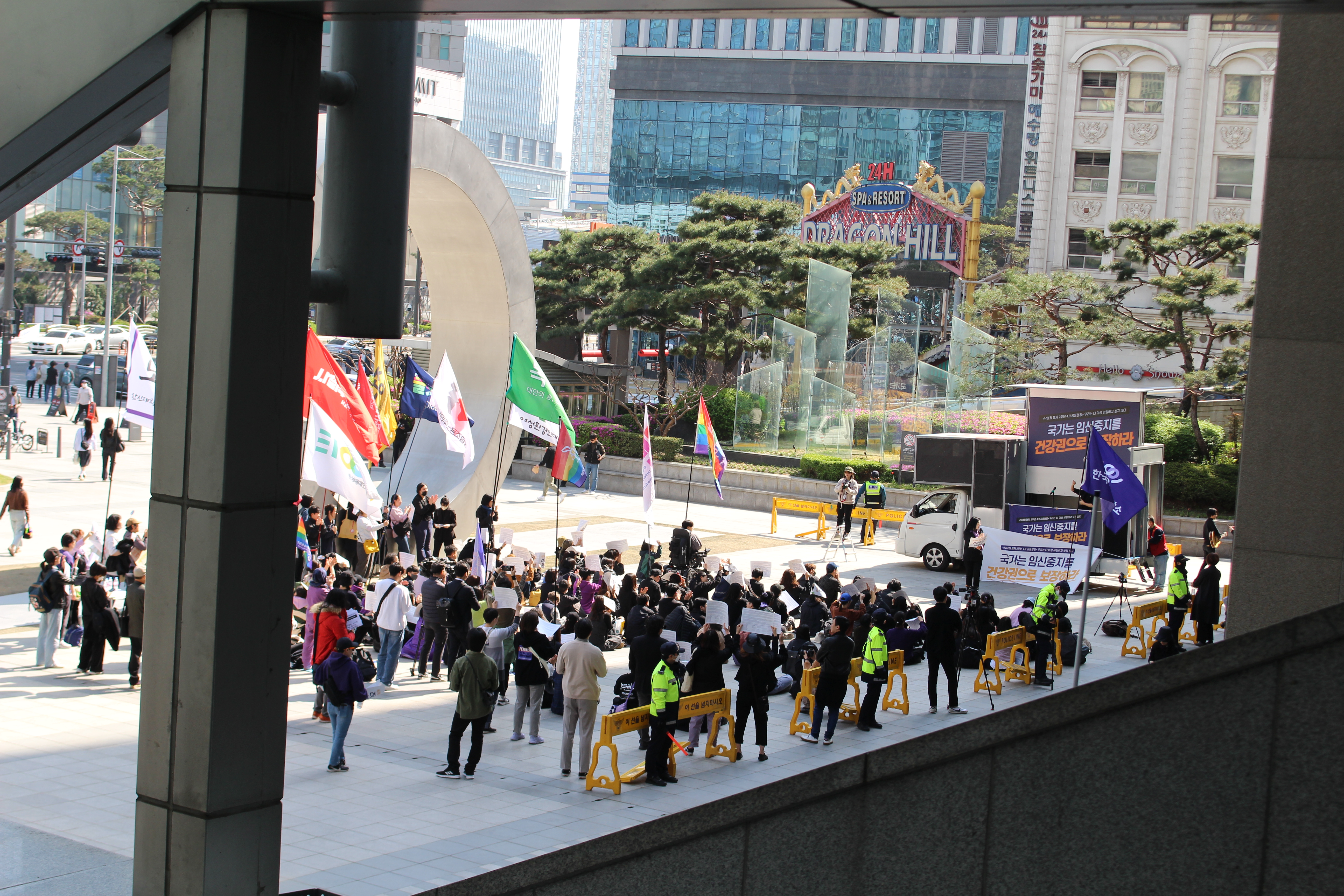 4월 9일 오후 2시, ‘낙태죄’ 헌법불합치 결정 2주년을 맞아 모두의 안전한 임신중지를 위한 권리보장 네트워크는 <우리는 더 이상 비밀이고 싶지 않다 국가는 임신중지를 건강권으로 보장하라!>집회를 개최했습니다. 시민들은 정부가 입법 공백을 핑계로 재생산권 보장 책임을 방기하는 것을 비판하기 위해, 국가가 임신중지를 건강권으로 보장할 것을 촉구하기 위해 용산역 광장에서 모였습니다. 한국성폭력상담소도 함께 집회에 참여했습니다.