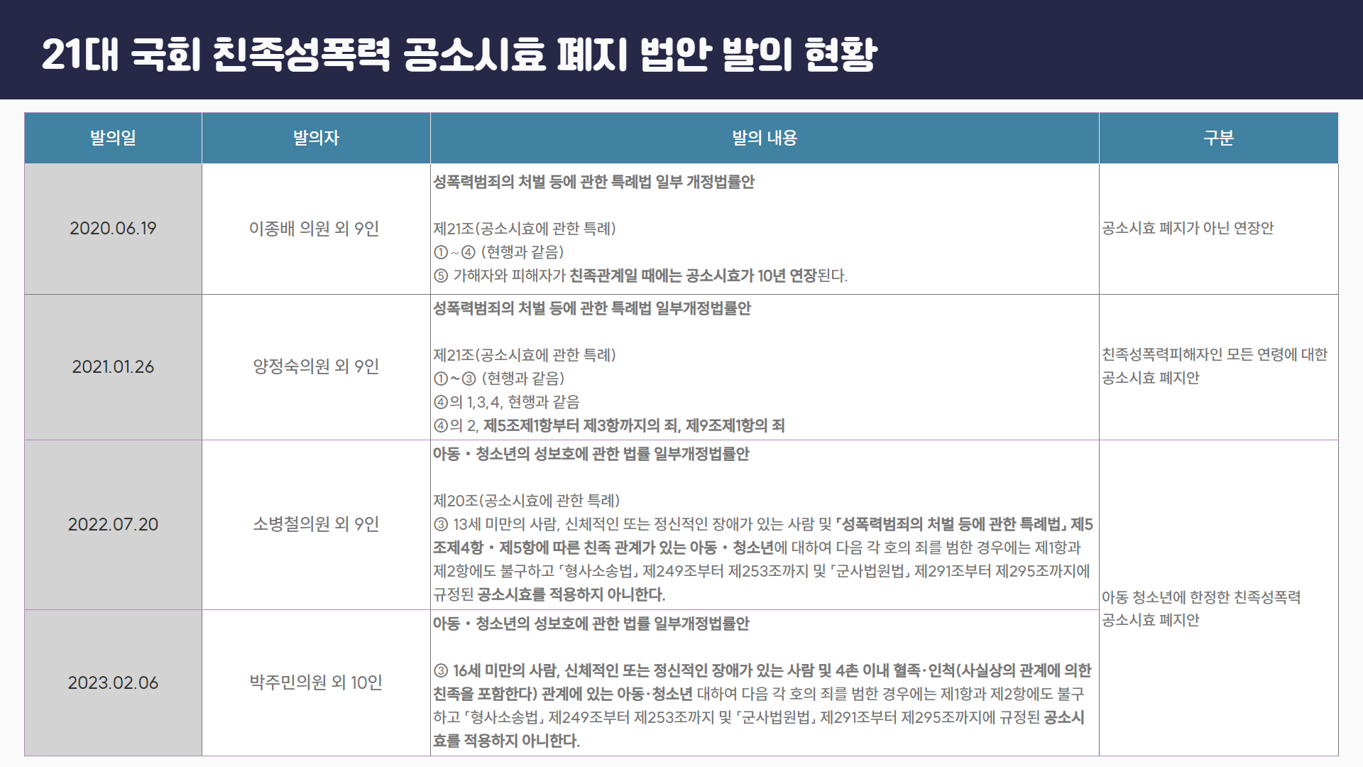 동은: 현재 21대 국회에서 발의된 법안을 살펴보고 입법운동에 대한 상황을 진단해 보자. 오늘 이 자리는 우리가 요구하는 안이 무엇인지 이해를 맞추고, 공소시효 폐지를 주장하는 논거를 다지는 시간이기도 하다.