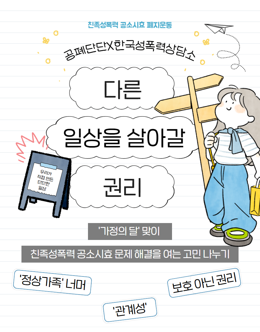 5월은 가정의 달입니다. ‘화목한 가정’에 대한 이미지와 ‘부모님의 사랑’에 관한 이야기가 쏟아지는 5월 한가운데, 친족성폭력 공소시효 폐지 운동에 대한 고민을 나누기 위해 한국성폭력상담소, 공폐단단 활동가들이 둘러앉았습니다.
