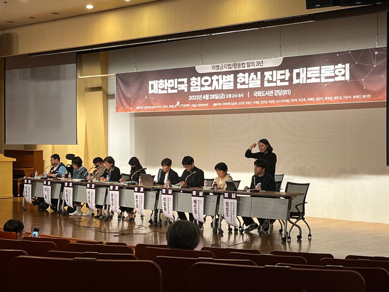 지난 4월 28일 금요일 오후 2시, 국회도서관 강당에서 <차별금지법/평등법 발의 3년 혐오차별 현실 진단 대토론회>가 열렸습니다. 차별금지법제정연대와 국가인권위원회 국회의원 이상민, 박주민, 권인숙, 장혜영의원이 공동 주관하고, 16명의 국회의원들(포스터 참고)이 공동주최한 이 토론회는 차별금지법/평등법이 발의되었으나 제정까지에는 이르지 못한 지금의 한국사회 혐오 차별 문제를 함께 진단하는 자리였습니다.