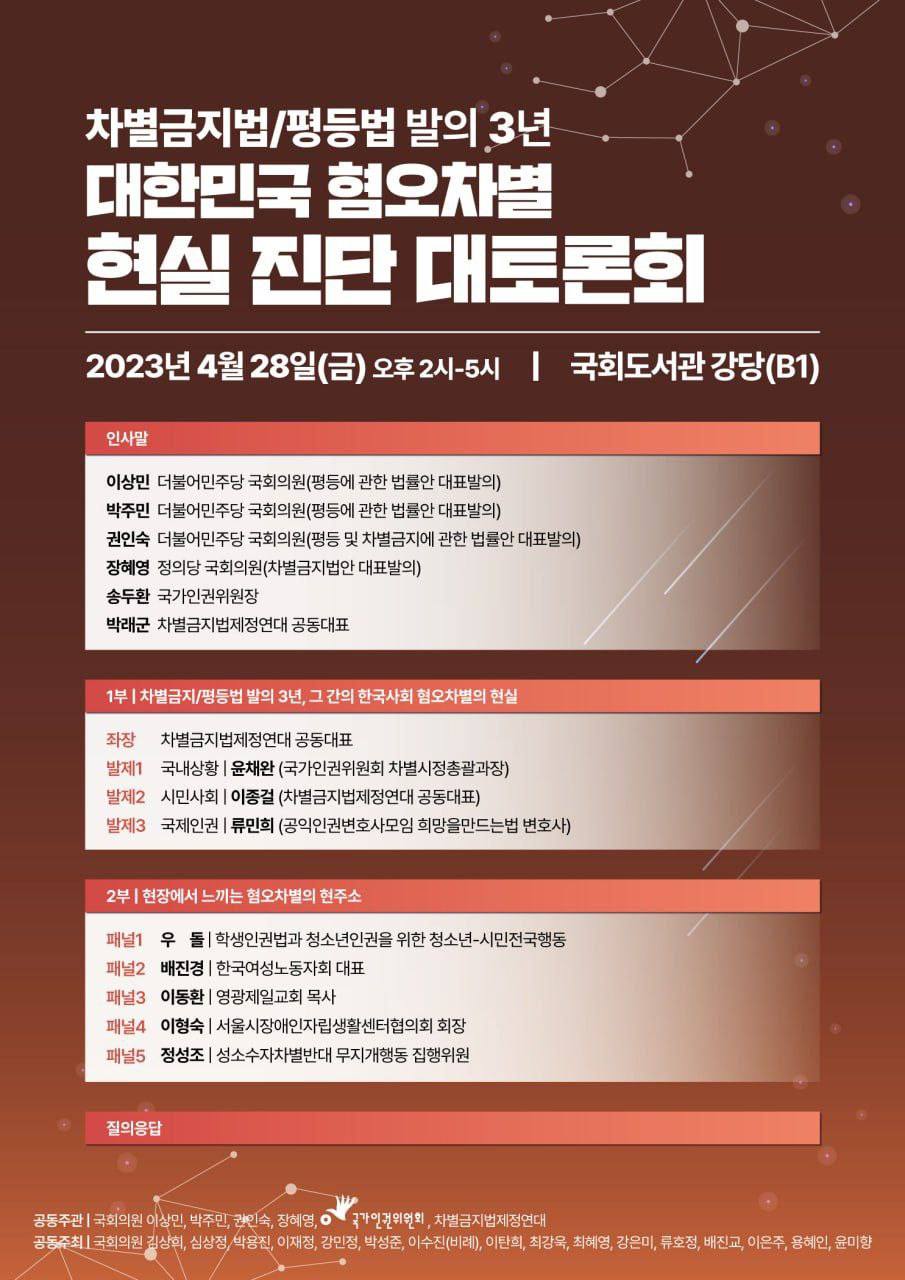지난 4월 28일 금요일 오후 2시, 국회도서관 강당에서 <차별금지법/평등법 발의 3년 혐오차별 현실 진단 대토론회>가 열렸습니다. 차별금지법제정연대와 국가인권위원회 국회의원 이상민, 박주민, 권인숙, 장혜영의원이 공동 주관하고, 16명의 국회의원들(포스터 참고)이 공동주최한 이 토론회는 차별금지법/평등법이 발의되었으나 제정까지에는 이르지 못한 지금의 한국사회 혐오 차별 문제를 함께 진단하는 자리였습니다.