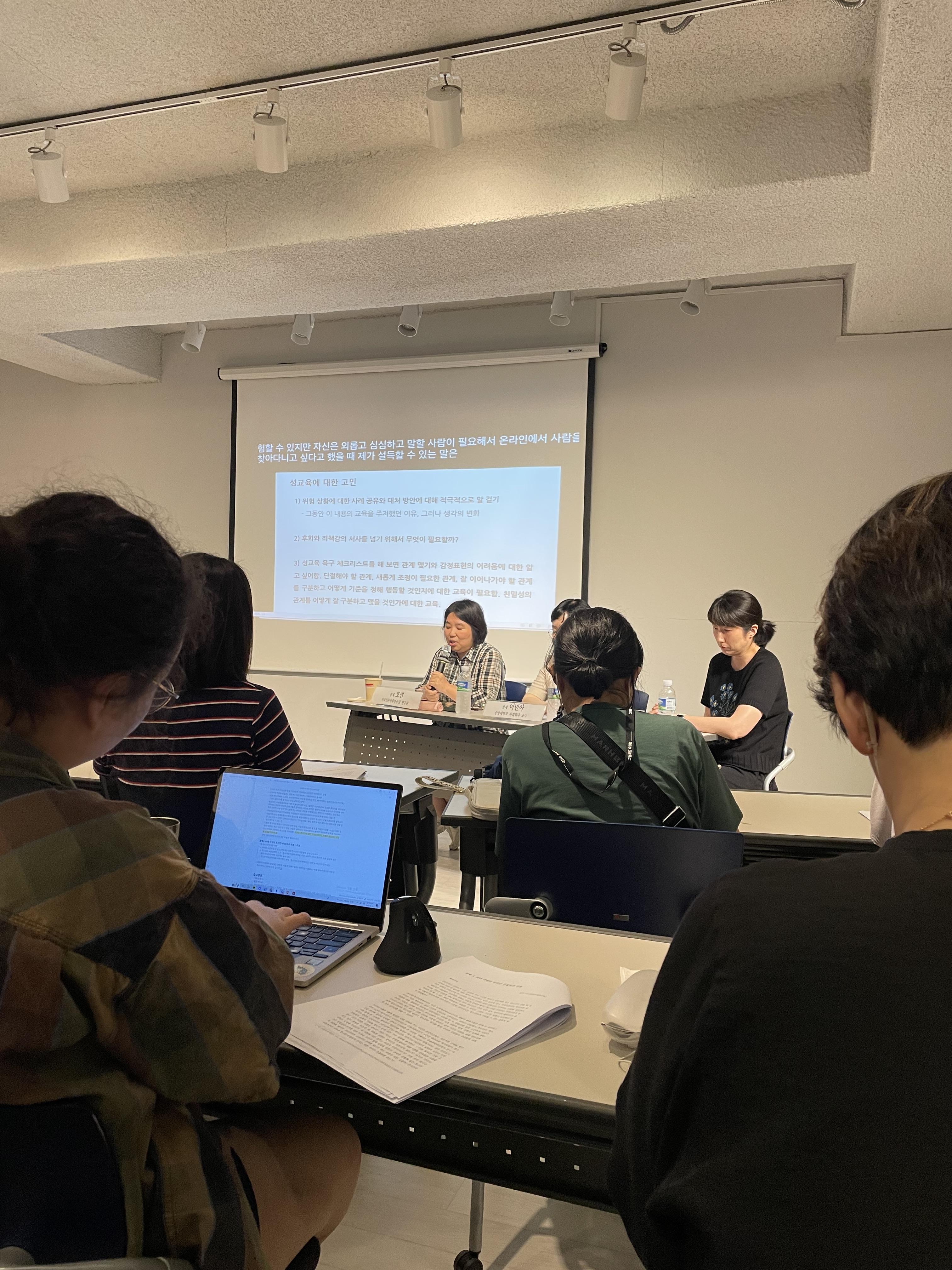 서두에 제안해주신 3가지 축을 중심으로 새롭게 제기된 질문들은 우울증 갤러리 사안을 이해할 때 취약성을 강조하고, 그럼으로써 보호를 요구하게 되는 언어가 아니라 폭력의 구조의 타겟이 될 수 있는 이들의 맥락을 경청할 수 있는 조건이 되어준다는 점에서 인상깊고 의미있었습니다. 발제해주신 연구 내용 모두 공유하고 싶지만 지면의 한계상 성교육에 대한 고민을 나눠주시며 어떤 말걸기가 유효할지 제안해주신 내용을 인용하며 마무리하도록 하겠습니다(자세한 내용은 추후 업로드될 자료집을 참고해주세요)