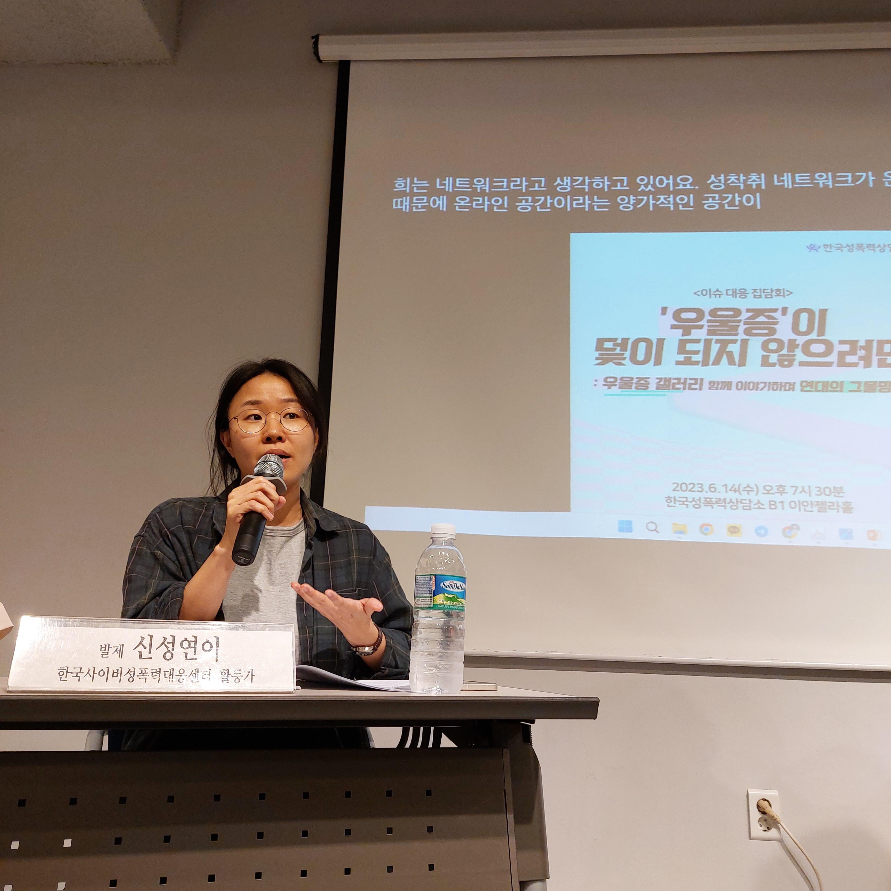 한국사이버성폭력대응센터 신성연이 활동가는 방심위가 경찰이 요청한 우울증 갤러리 임시 폐쇄 조치 요청에 대한 심의에서 “과잉규제 우려“로 인해 “자율규제 강화”를 의결하였는데 이 같은 결정은 사실상 효용을 기대하기 어렵다는 점에서 문제적일뿐 아니라 온라인 공간에 대한 부족한 이해를 보여주었다고 지적했습니다. 온라인 공간은 단지 성착취 피해가 발생한 플랫폼이 아니며 피해가 구성되는 요소라는 점에서 이 공간의 “역사, 특징, 구성원에 대한 면밀한 분석”과 대응계획이 수립되어야한다고 짚어주셨습니다. 디시인사이드는 우울에 관한 말하기가 나타나는 여러 온라인 공간 가운데서도 괴로움과 고통에 대한 표현방식과 정도를 제재하지 않고 이야기할 수 있는 공간으로 여겨지고 있고 이는 유저들에게 일종의 ‘해방감’을 느끼게 한다고 설명하였습니다. 그러나 “정신건강의 취약함을 드러낸 여성은 온라인 상에서 그루밍의 위험에 처한다는 사실은 우울감을 표현할 자유, 익명의 공간을 사용할 자유가 젠더화 되어 있음을 보여준다”고 설명하였습니다. .