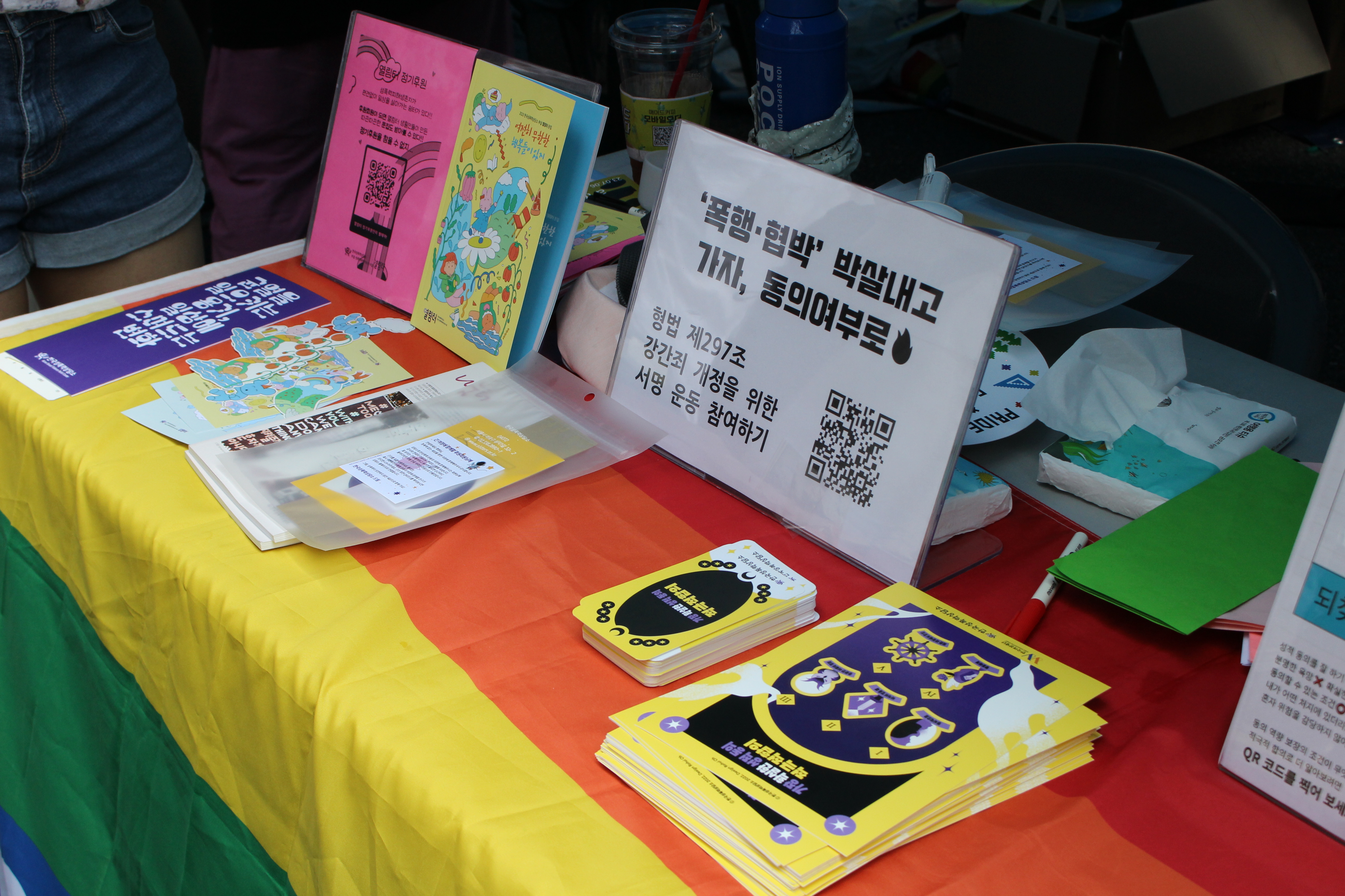 먼저 저희 부스에서 가장 먼저 눈에 띄는 건 바로 ‘비동의 강간죄 LGBTQ+ 권리 버전 Q&A’ 리플렛이었어요. 성적 권리와 적극적 합의에 관한 Q&A를 LGBTQ+ 권리 버전으로 새롭게 구성되어 비치되었습니다. 구체적으로 폭행 및 협박 구성요건의 문제점, 성폭력 관련 법에 있는 낙인과 차별, 성적 동의 등 다양한 내용이 담겼어요.