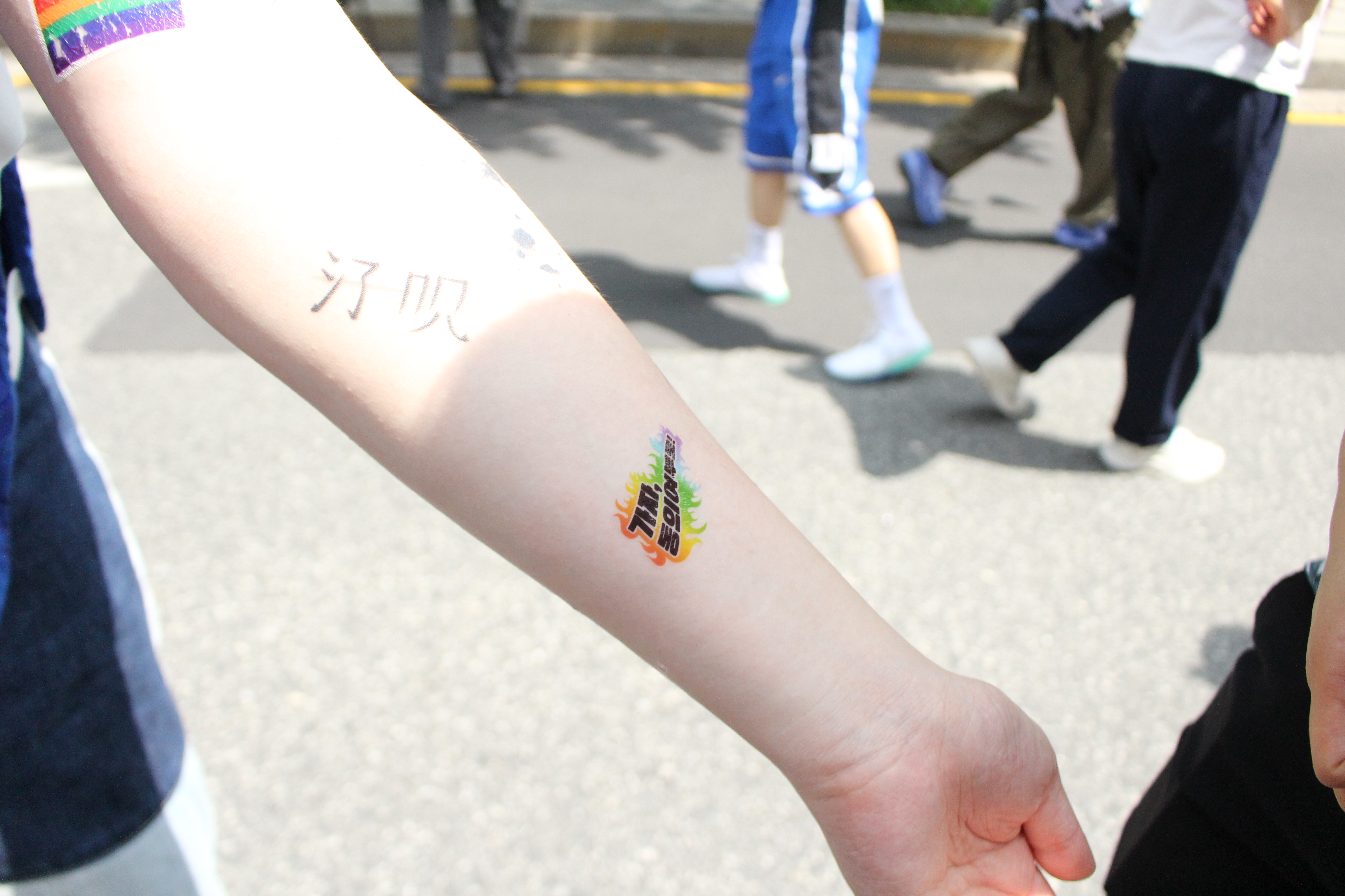 저희가 준비한 타투는 ‘가자, 동의여부로’라는 문구와 함께 무지개색 불꽃을 표현한 디자인이었어요. 손등, 얼굴, 팔목 등 원하는 곳에 타투스티커를 붙이시곤 기뻐하는 모습에 저희도 덩달아 즐거웠습니다.