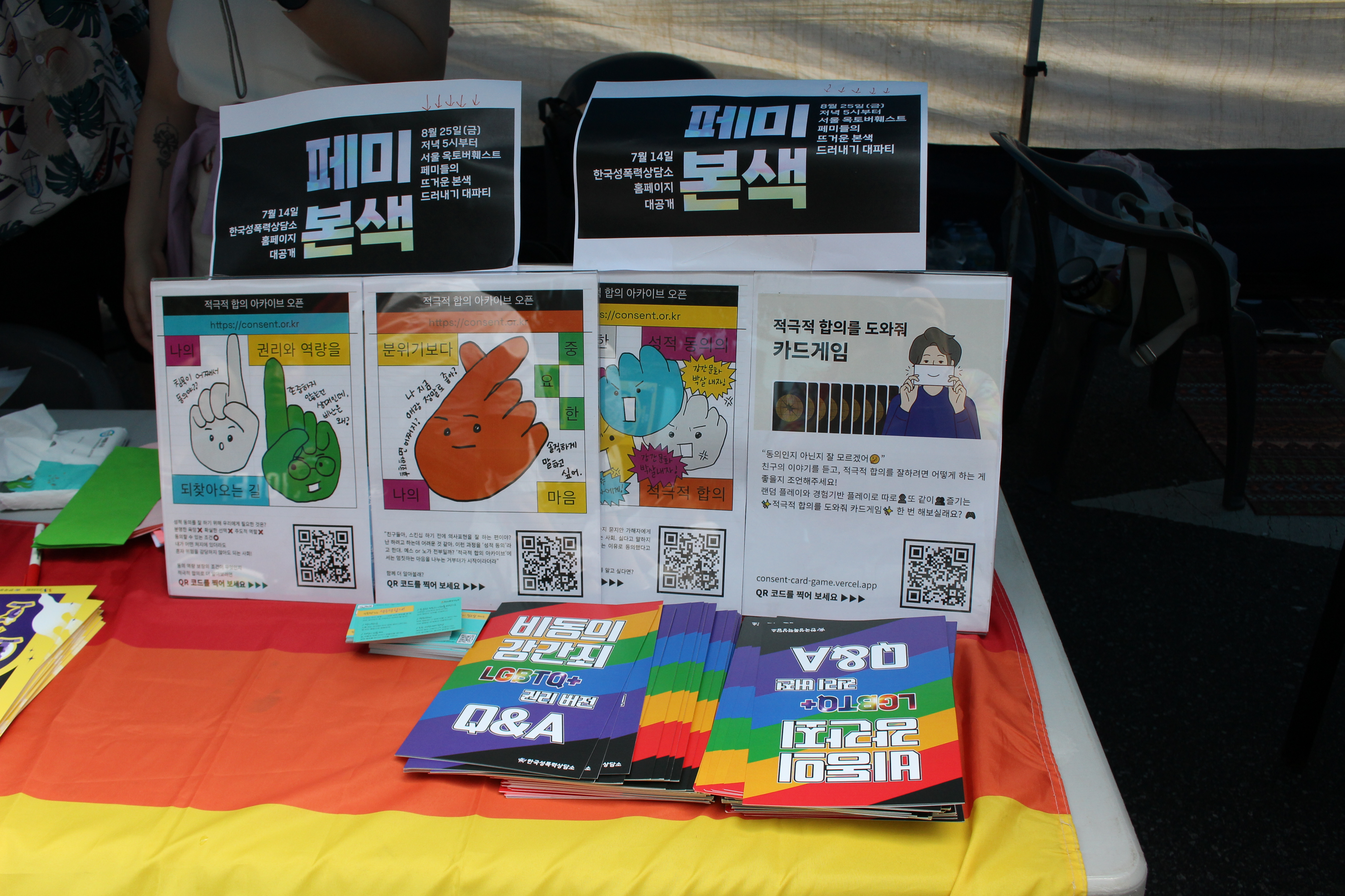이외에도 형법 제297조 강간죄 개정을 위한 서명 운동 참여를 독려하고, 적극적 합의 아카이브와 적극적 합의 카드게임에 대한 정보도 전시해두었어요. 그리고 8월 25일에 열리는 한국성폭력상담소 후원의 밤 <페미본색>도 많은 분들께 알렸답니다. 부스 한켠에는 한국성폭력상담소 후원 신청도 받았어요.