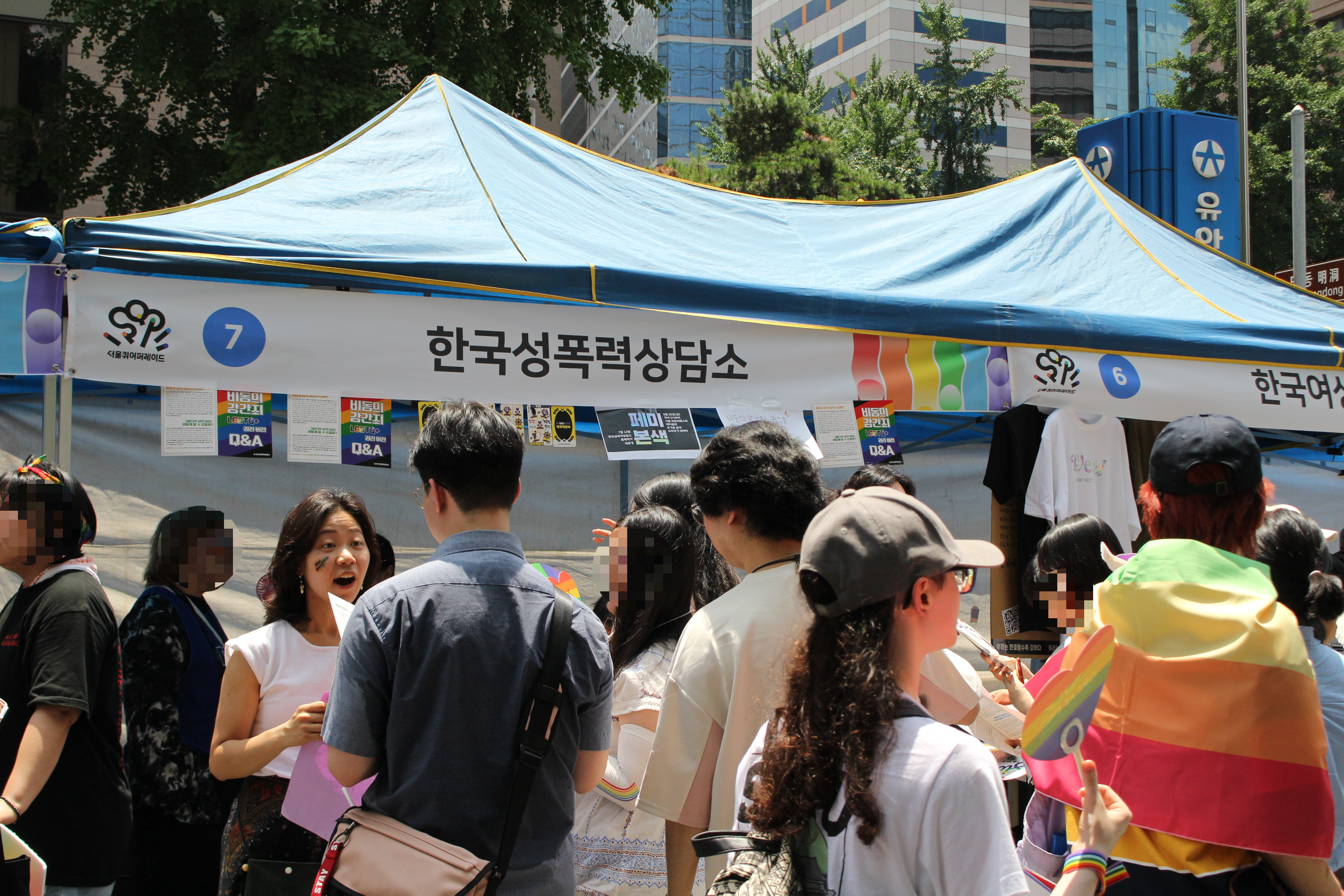 이번 서울퀴어문화축제는 을지로입구역 일대에서 열려 이전과 사뭇 다른 모습이었는데요. 도착해보니 을지로입구역 일대에 양 끝 입구와 출구 사이에 일렬로 부스가 늘어서 있었습니다. 저희 한국성폭력상담소는 7번 부스에서 오전 11시부터 부스를 운영했어요.