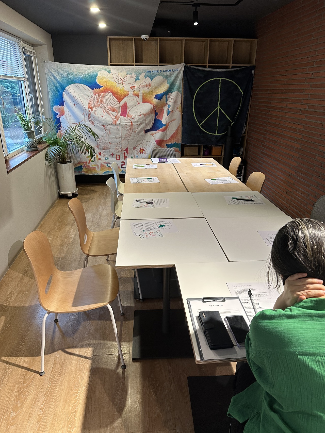 서로가 서로의 얼굴을 볼 수 있게 둘러 앉아서 진행을 합니다. 테이블 모양 때문에 네모가 되기도 하는데, 가능한 한 원의 느낌을 주려고 하고 있어요. 그리고 두 시간 동안 자유롭게 이야기를 나눈 다음에 9시가 되면 엽서를 한 장씩 나눠주는데, 작은말하기에 대한 소감을 짧게 적는 시간을 갖습니다.