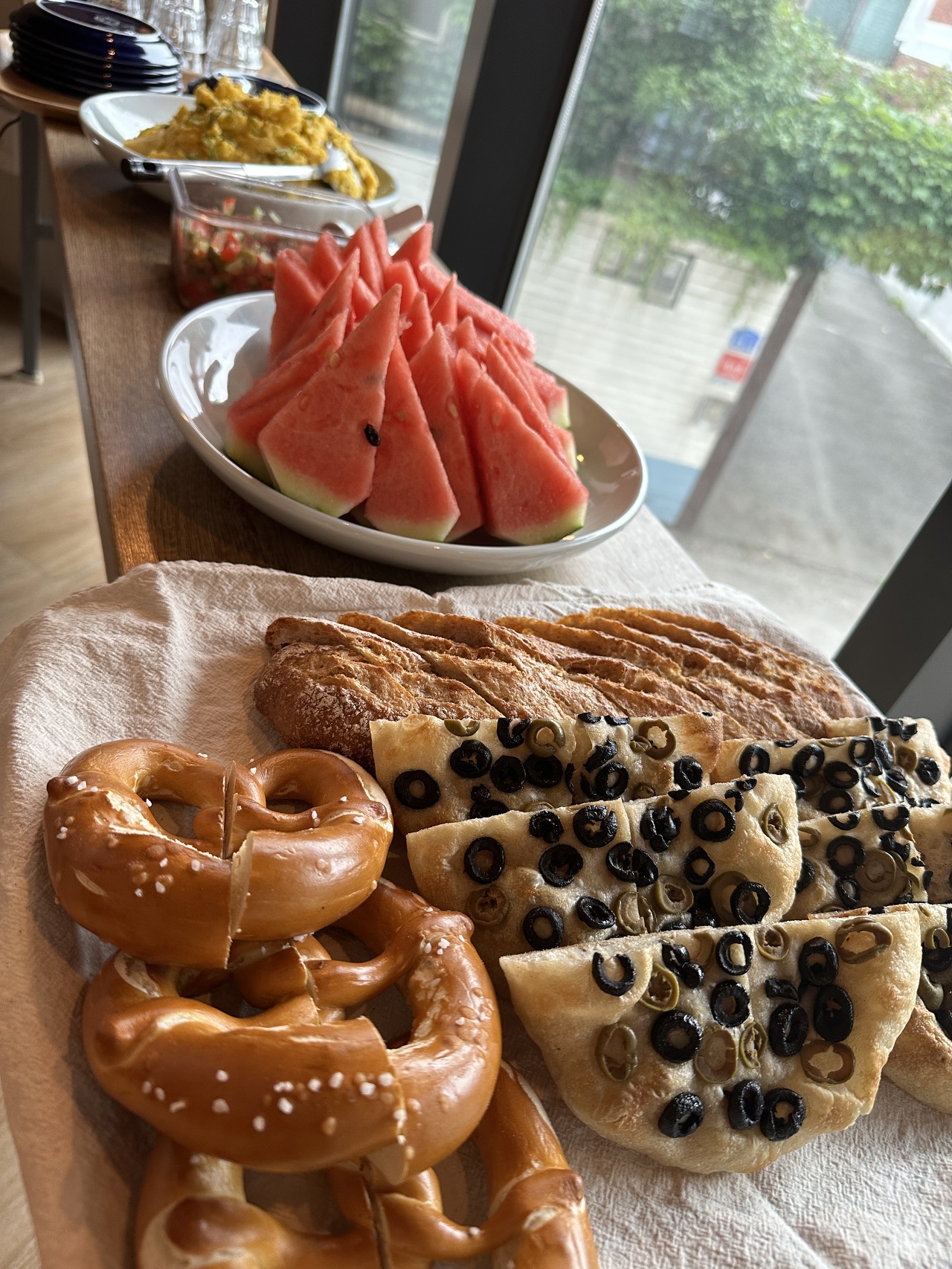 각종 빵과 수박이 먹음직스럽다