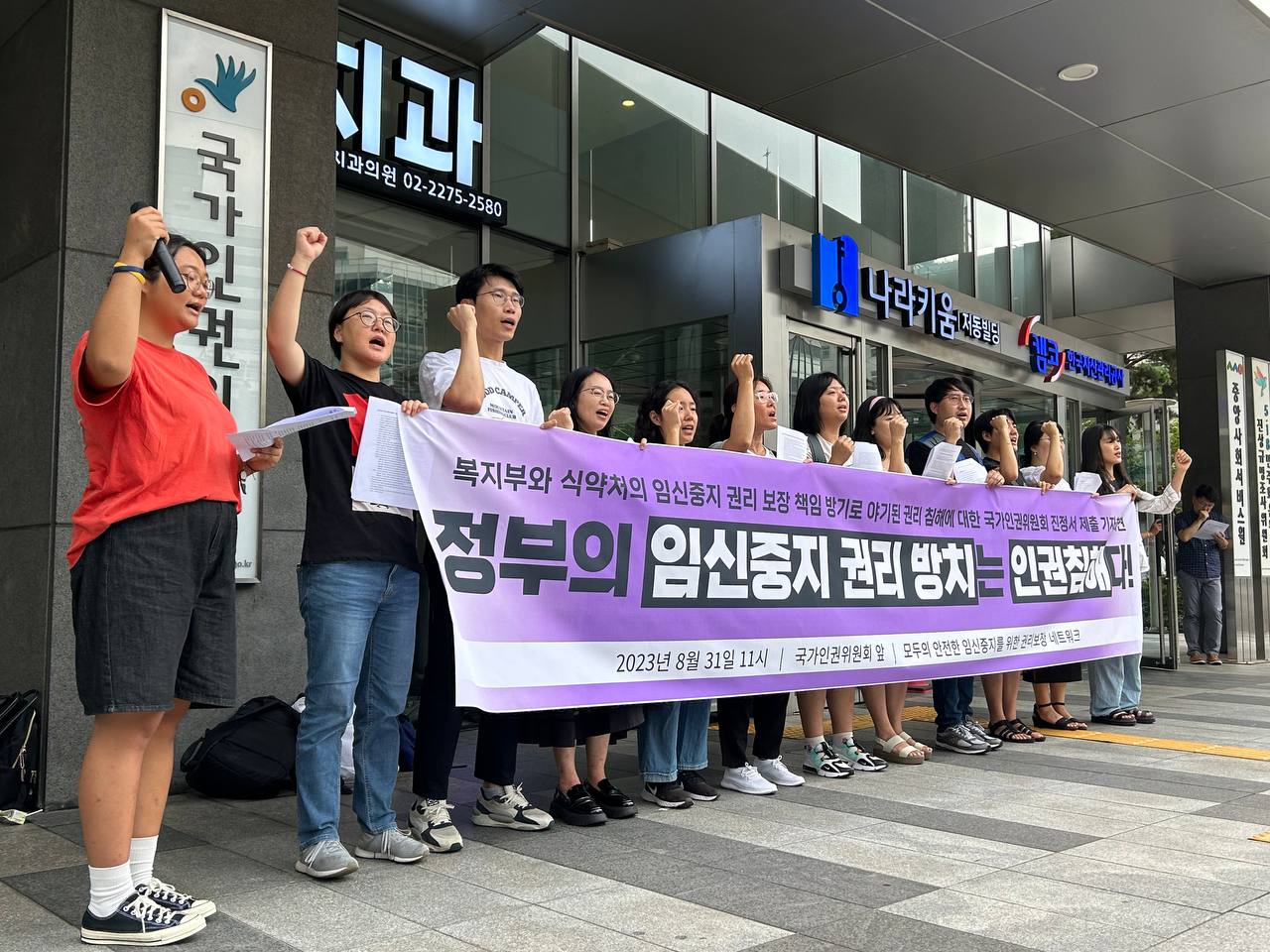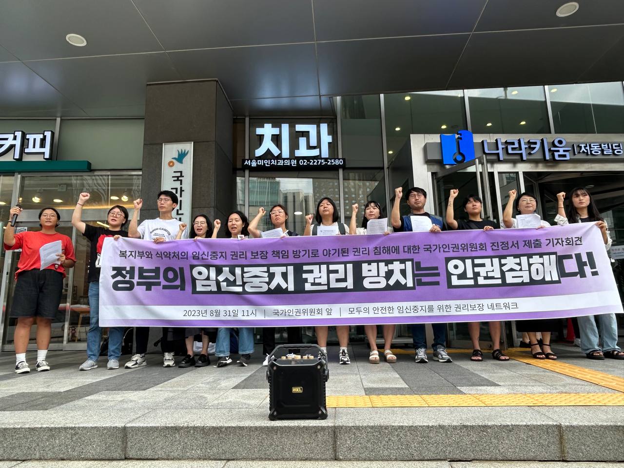 8월 31일, 모두의안전한임신중지를위한권리보장네트워크(이하 모임넷)는 국가인권위원회 본사 앞에서 “정부의 임신중지 권리 방치는 인권침해다!”를 제목으로 한 기자회견을 진행했습니다. 한국성폭력상담소는 활동가 유랑이 발언하고, 자원활동가 가을, 너굴이 현장에 함께 참여했습니다.