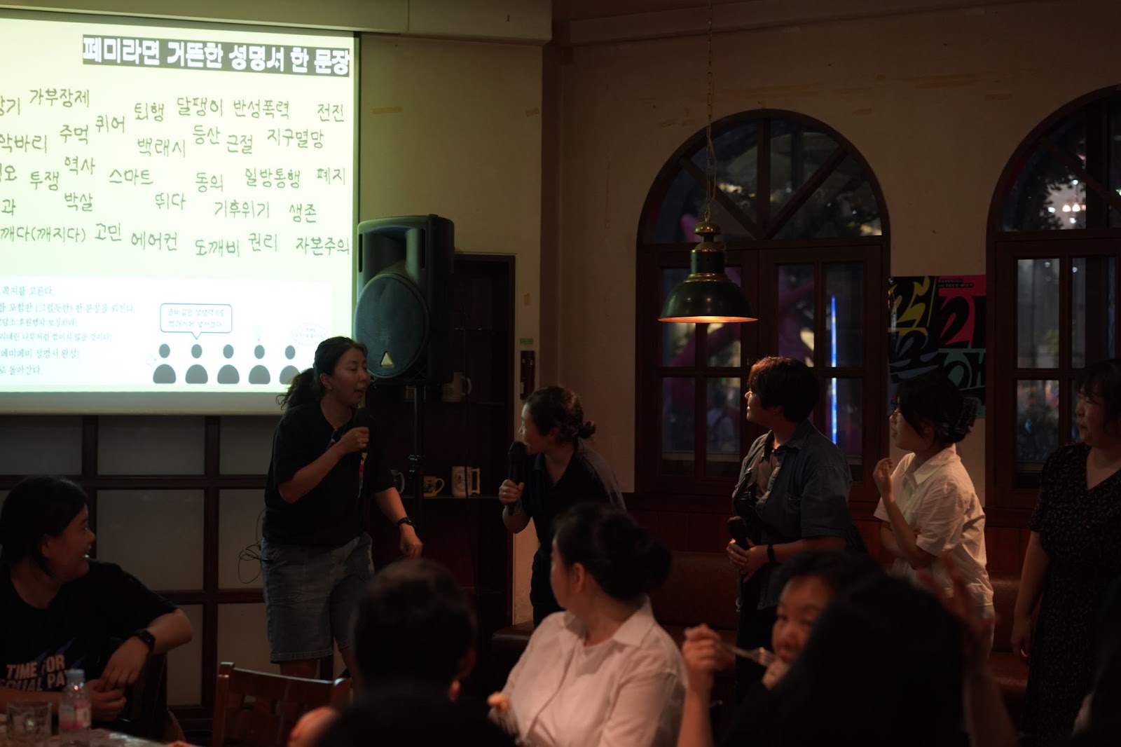 스텔라 기자의 바톤을 이어받아 후기를 쓰는 저는 상담소의 산 활동가입니다:) 저는 이번 <페미본색>을 총괄한 회원홍보팀에 소속되어 있는데요. 덕분에 그 누구보다 밀접하고 가깝게, <페미본색>의 기획부터 마무리까지 함께할 수 있었습니다. 이번 후기에서는 성명서 게임 이후 이어진 무대 이벤트와, 마감시간까지도 식지 않았던 현장의 열기를 전해드리고자 합니다.