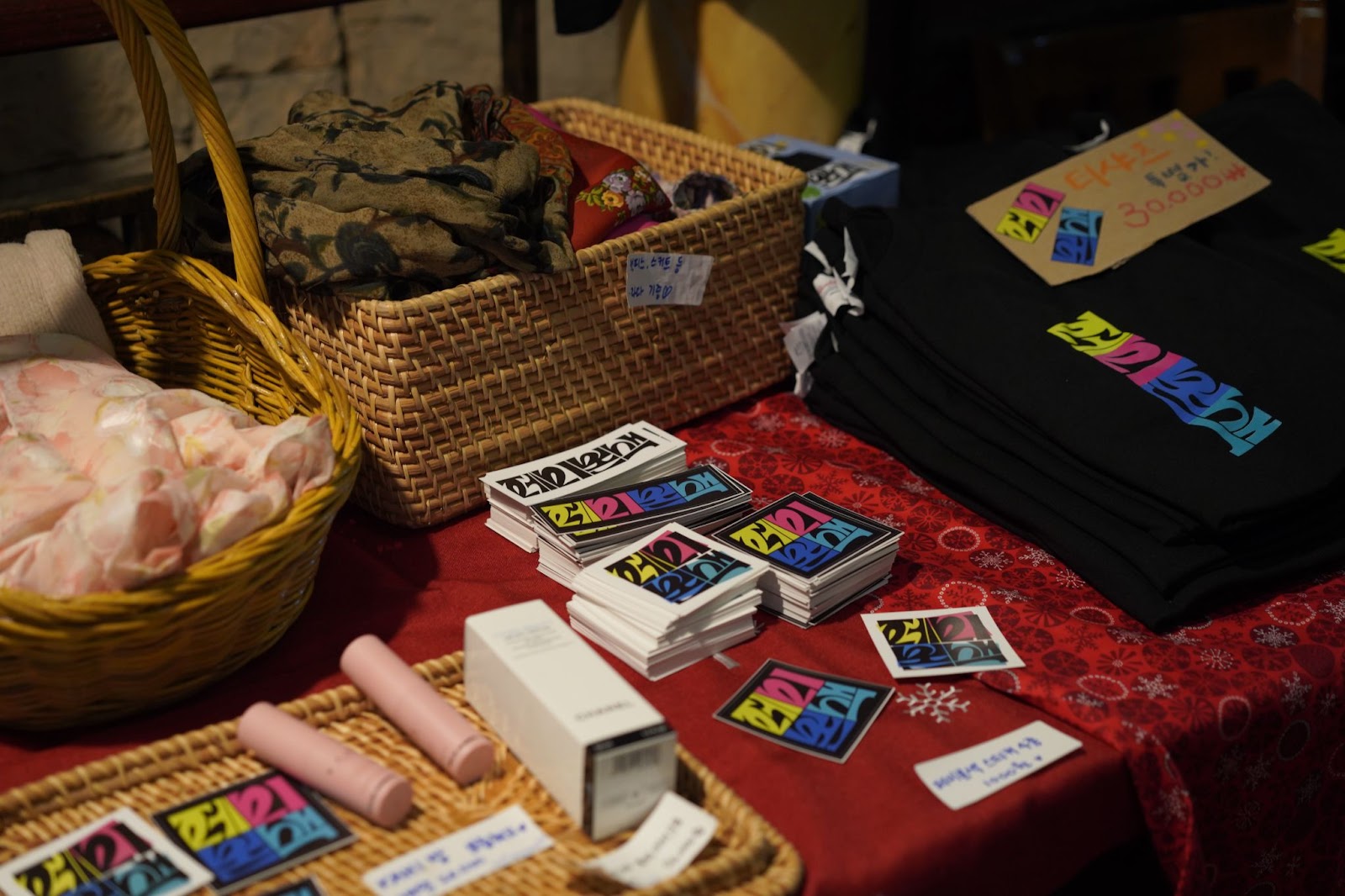 한편, 페미방판 코너는 완판을 향해 달려가고 있었습니다. <페미본색> 티셔츠와, 아쉽게도 경매에는 올라가지 못한 후원 물품들, 그리고 그 자리에서 선뜻 후원으로 내어주신 물품들까지! 옷, 화장품, 타로카드, 그릇, 핸드드리퍼 등등 그 종류도 다양했는데요. 페미방판 코너를 지나 홀로 입장하는 후원자 여러분을 사로잡기에 아주 충분했답니다😆 (그리고 실제로 완판을 해냈습니다!!)