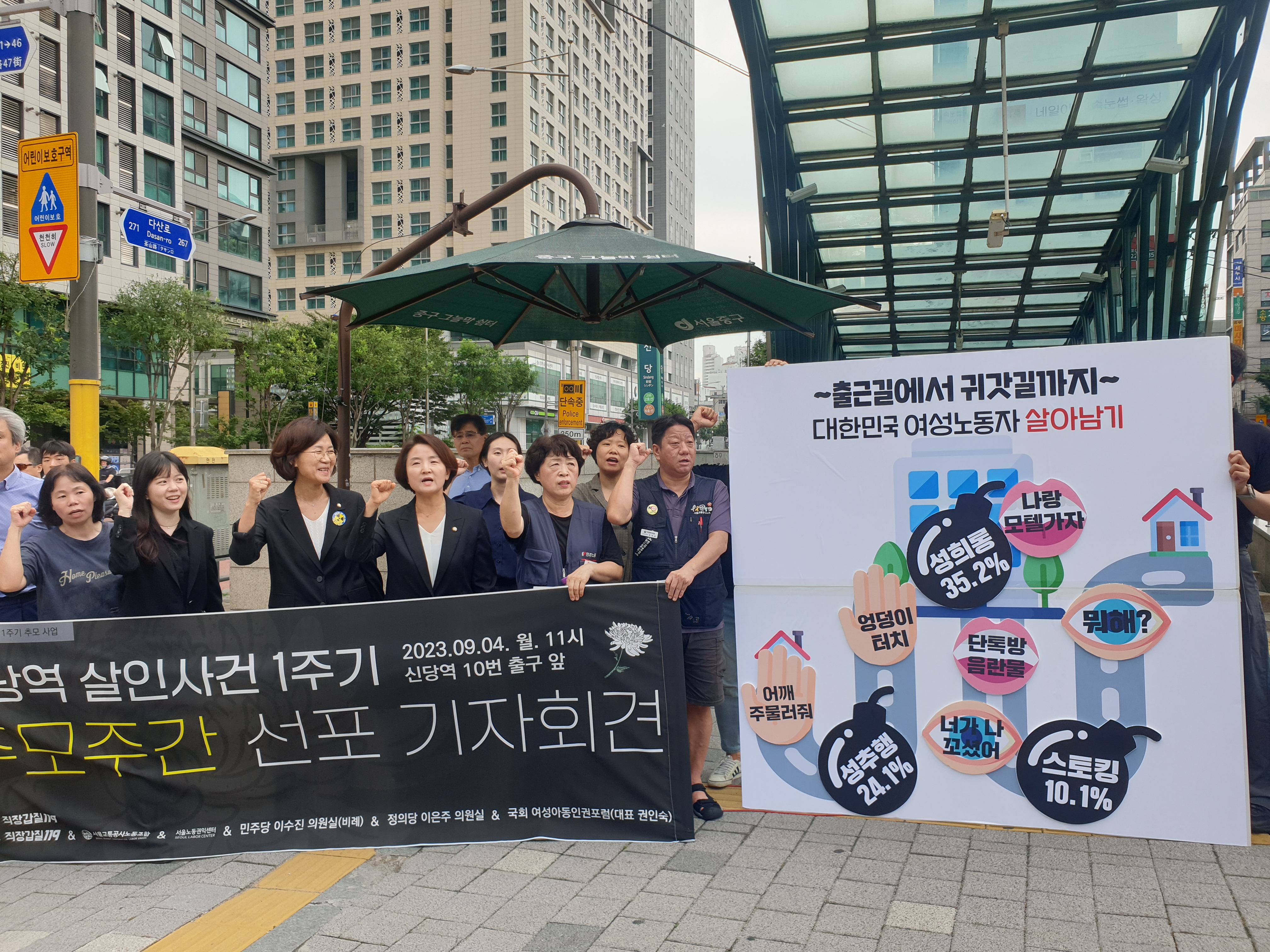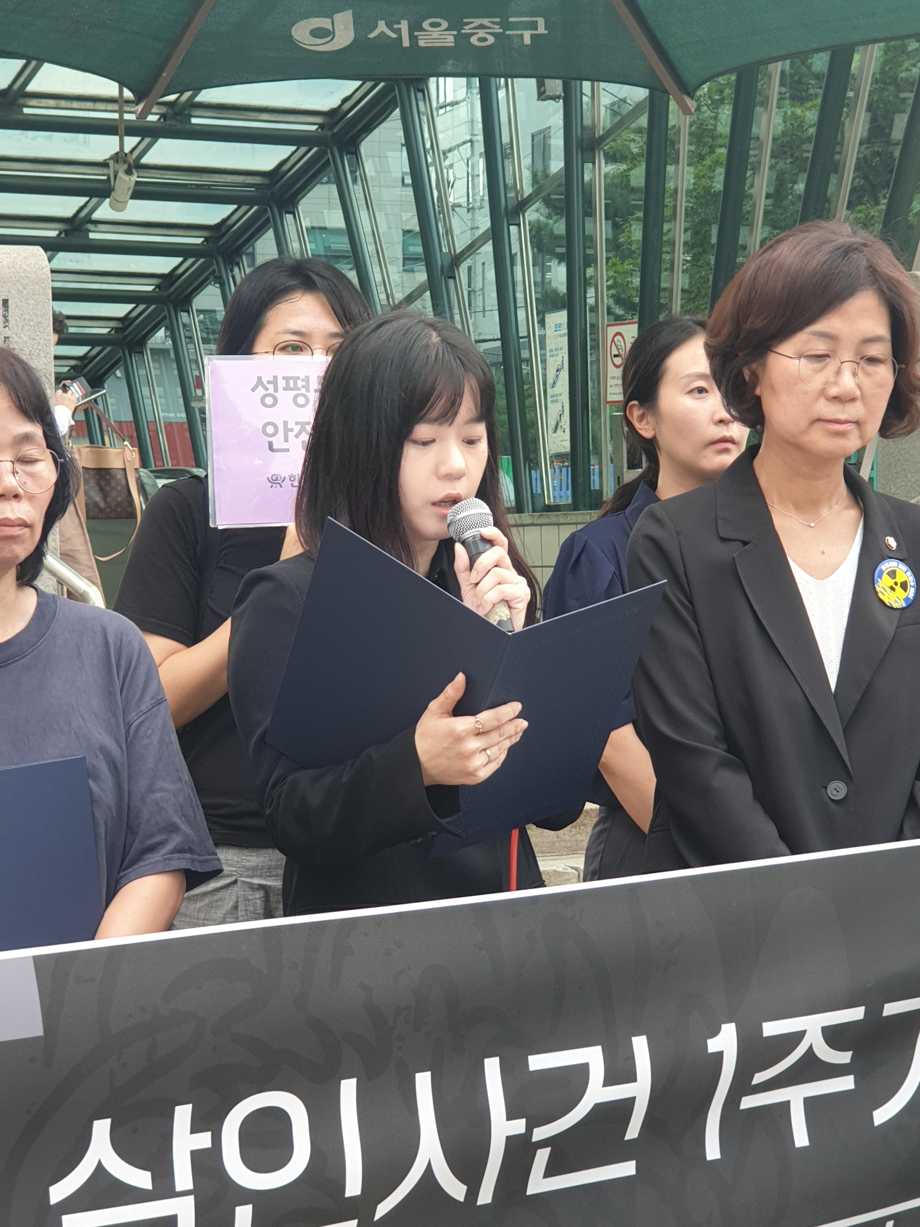 신당역 사건 발생 후, 1년이 되었습니다. 직장갑질 119와 서울교통공사노조, 서울노동권익센터, 민주당 이수진 의원실, 정의당 이은주 의원실, 국회 여성아동인권포럼은 공동주최로 신당역 스토킹 살인사건 1주기 추모주간을 선포하고 기자회견, 토론회, 추모집회를 진행하였습니다. 한국성폭력상담소도 이에 연명하며 추모주간에 함께했습니다. 아래는 추모주간 선포 기자회견의 발언 내용입니다.
