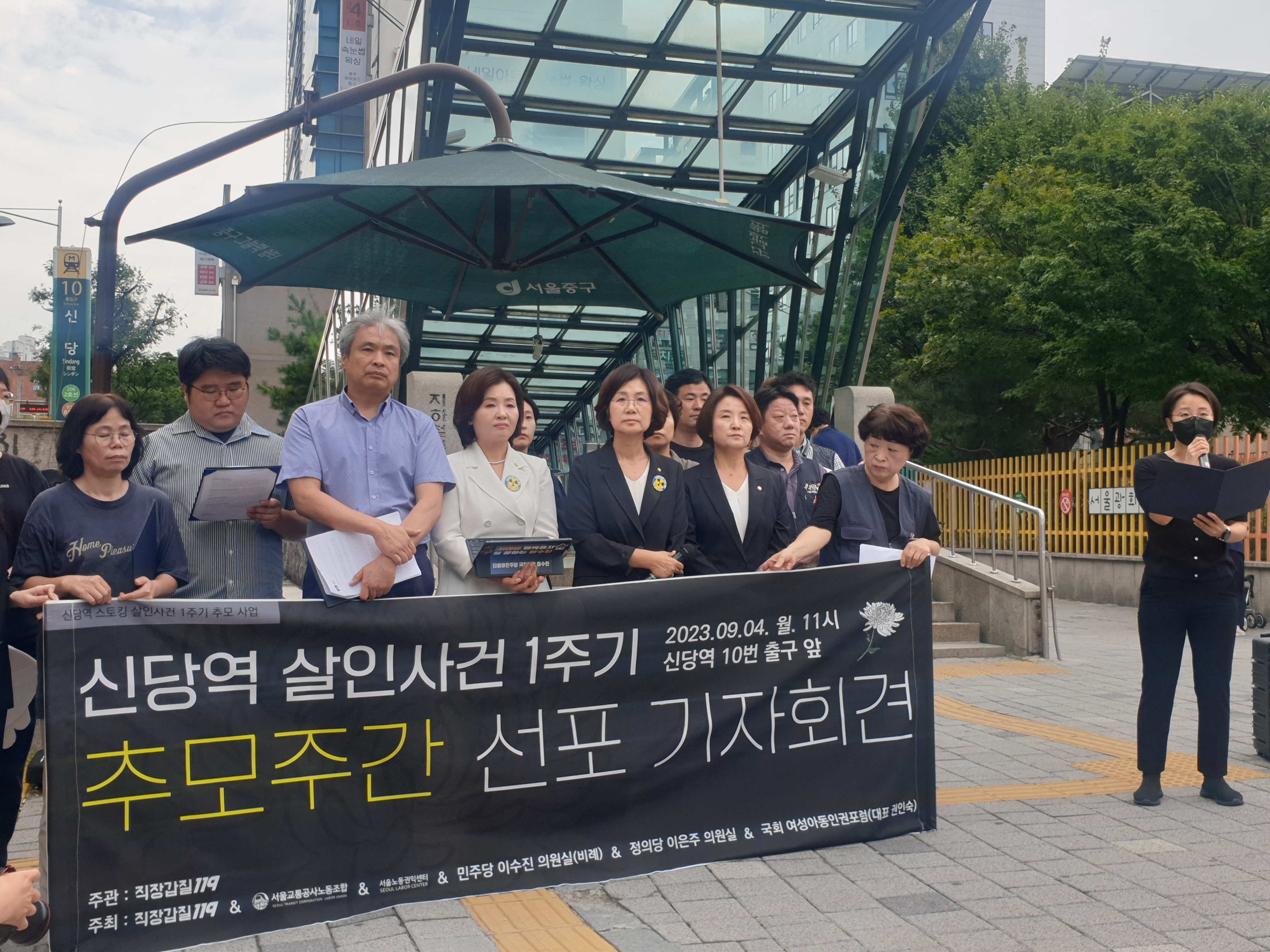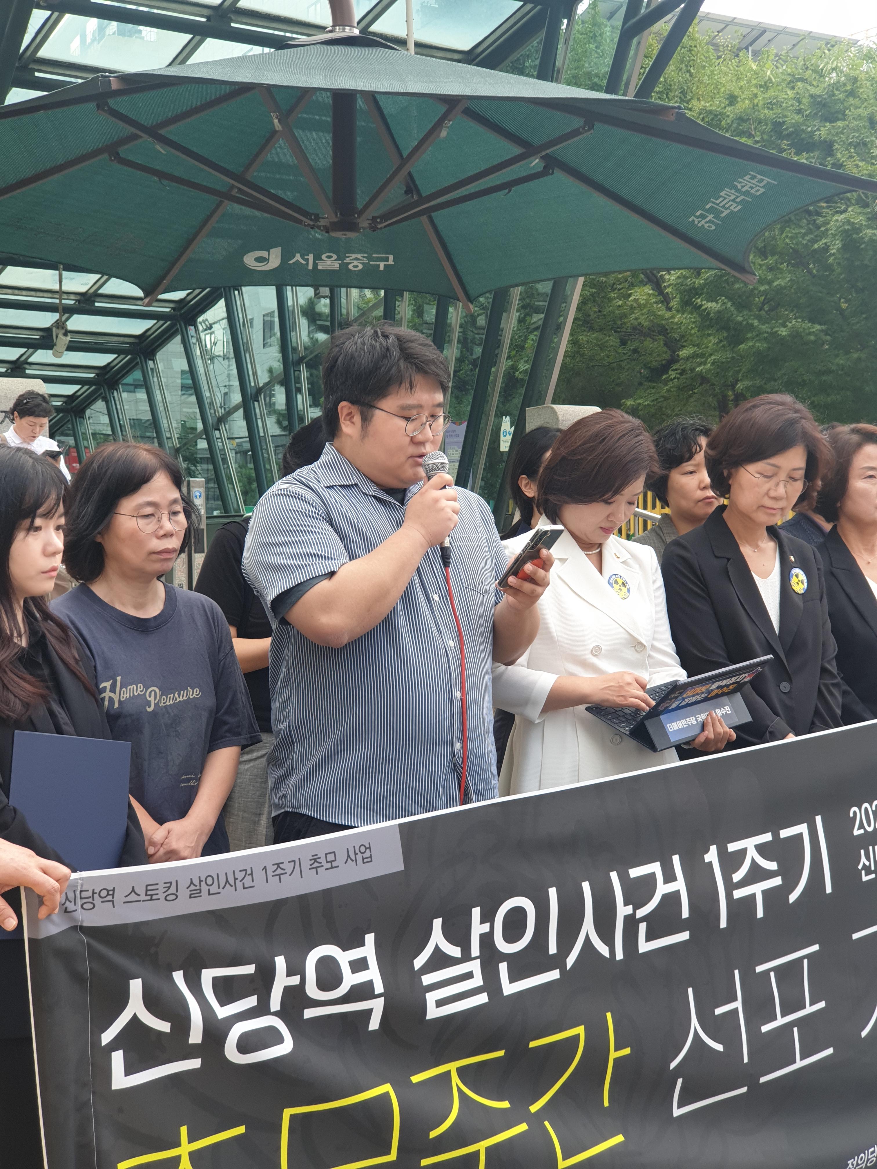 신당역 사건 발생 후, 1년이 되었습니다. 직장갑질 119와 서울교통공사노조, 서울노동권익센터, 민주당 이수진 의원실, 정의당 이은주 의원실, 국회 여성아동인권포럼은 공동주최로 신당역 스토킹 살인사건 1주기 추모주간을 선포하고 기자회견, 토론회, 추모집회를 진행하였습니다. 한국성폭력상담소도 이에 연명하며 추모주간에 함께했습니다. 아래는 추모주간 선포 기자회견의 발언 내용입니다.