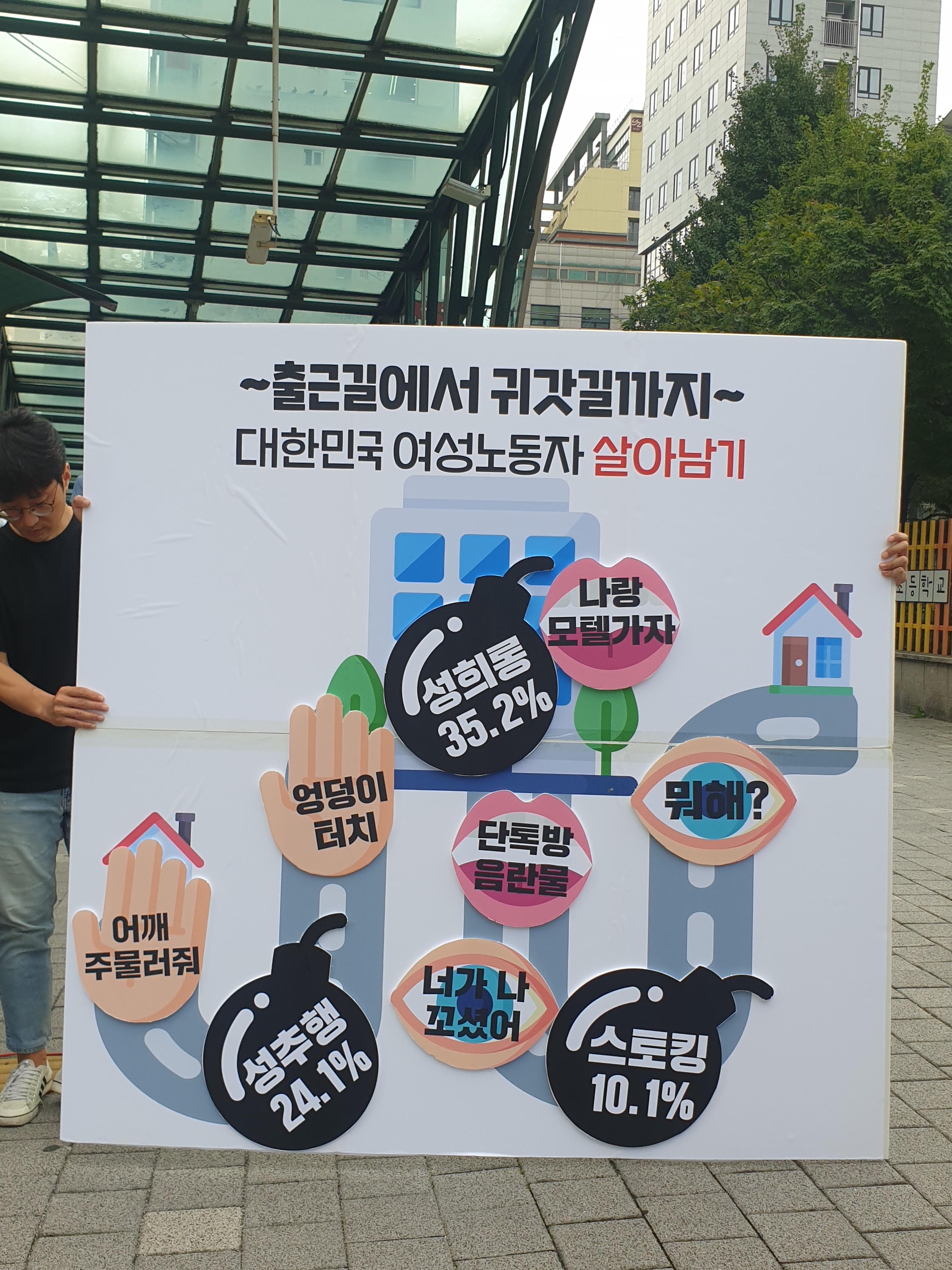 발언과 공동 기자회견문 낭독이 끝난 후, 퍼포먼스가 이어졌습니다. 대한민국 여성노동자의 출근길부터 귀갓길까지 여정을 함께 따라가는 퍼포먼스였습니다. 여성노동자의 24.1%는 직장 내에서 성추행을 경험한 적이 있고 35.2%가 성희롱을 경험했습니다. 그리고 10.1%는 스토킹을 경험했습니다. 안전해야하는 일터에서 젠더폭력에 노출된 여성노동자의 현실을 알 수 있는 퍼포먼스였습니다.