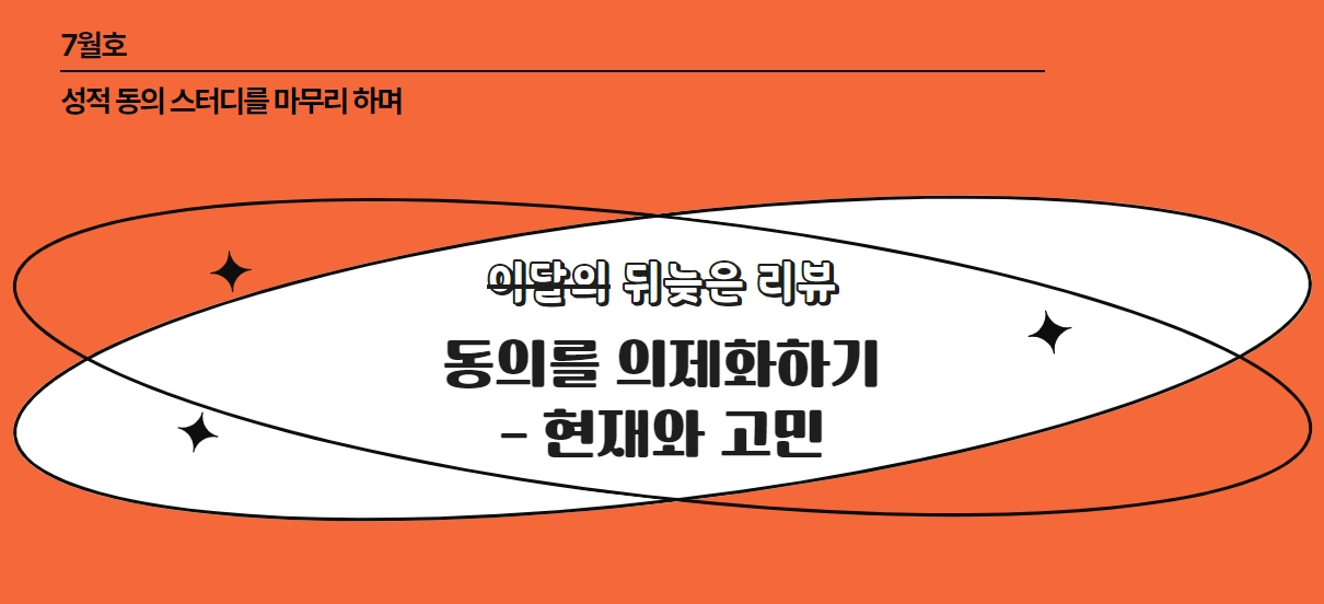 이것으로 동의 스터디는 마무리 되었습니다. 2월부터 7월까지 진행되었던 스터디를 통해 관점도 언어도 깊어지는 소중한 시간이었어요. 성문화운동팀의 신아, 동은, 유랑 활동가와 함께 공부해주었던 호연, 이산, 동글, 호랑, 오매, 란에게 감사의 마음도 전합니다. 한 구성원의 짤막한 마무리 소감을 공유해봅니다.
