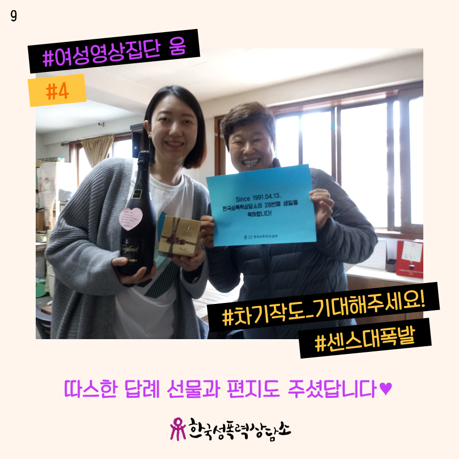 지난 4월 13일은 한국성폭력상담소의 28번째 생일이었습니다. 그 전날인 4월 12일, 상담소 활동가들이 정성들여 준비한 생일떡을 이웃과 나누었는데요, 어떤 일이 있었는지 함께 보러가실까요?