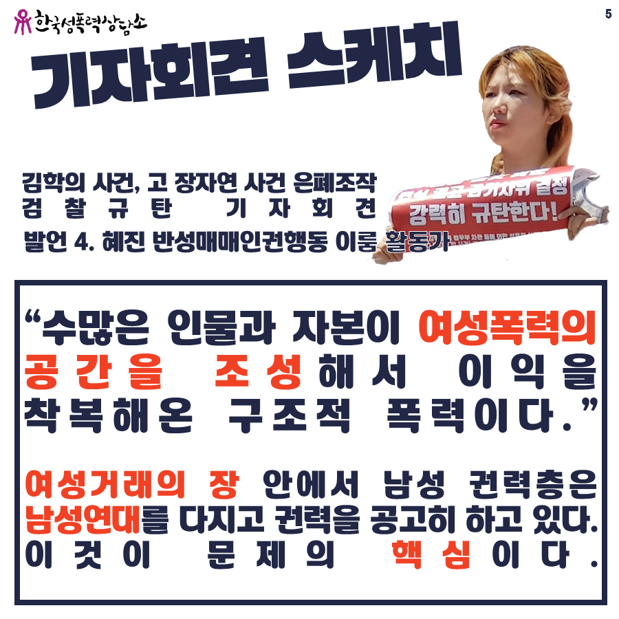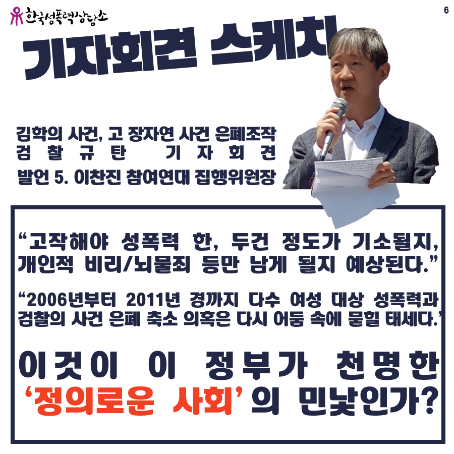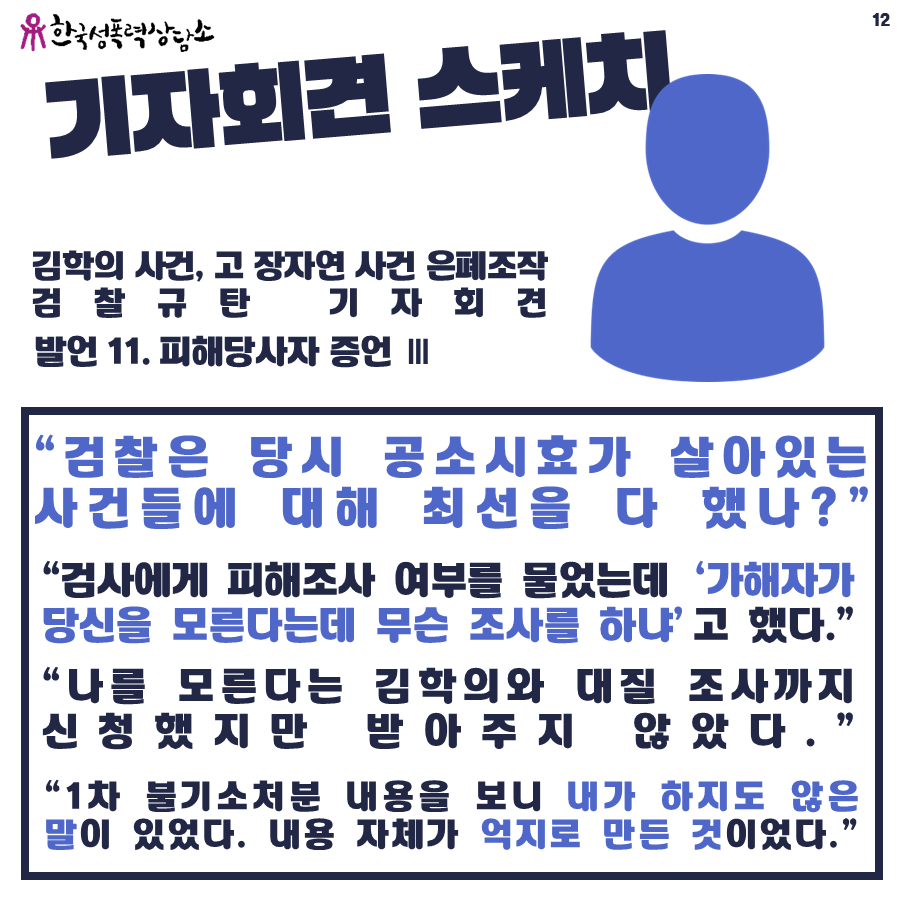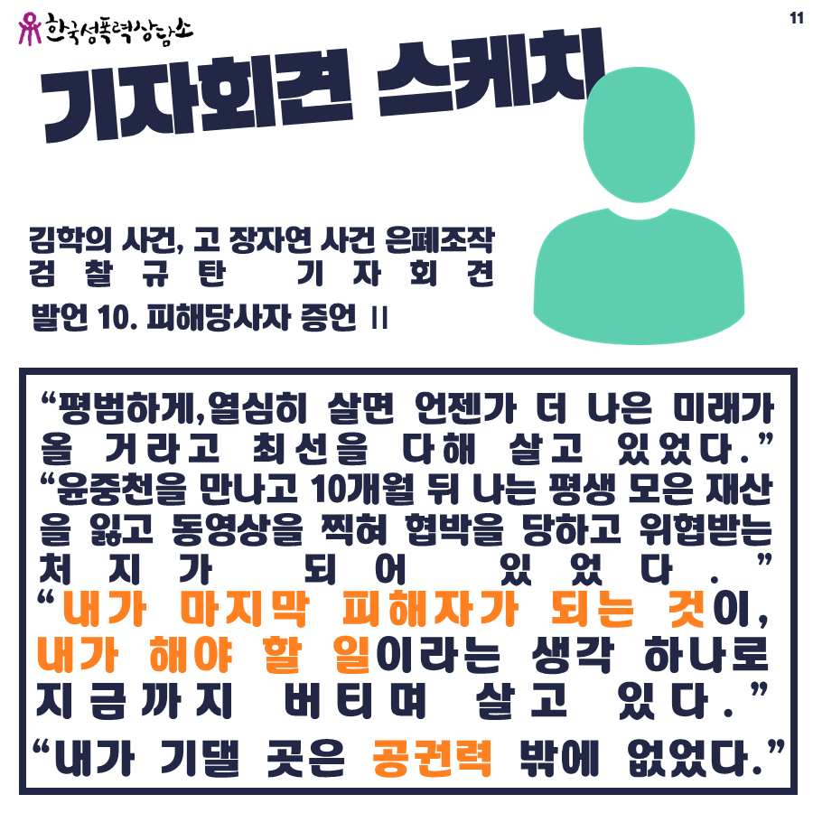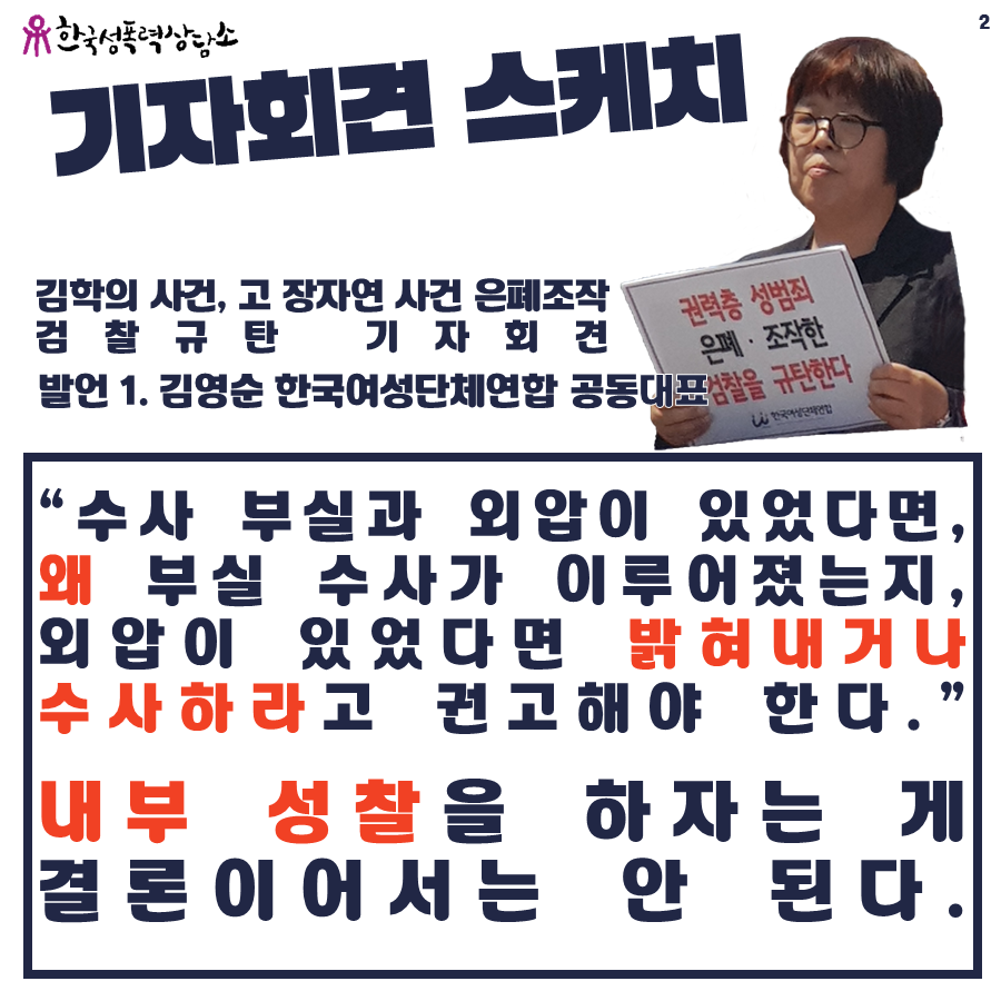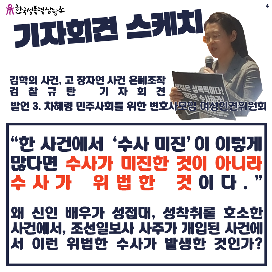지난 5월 22일, 세종문화회관 앞 계단에서 <김학의 전 법무부차관 등에 의한 성폭력사건>, <고(故) 장자연 씨 사건> 등 권력층에 의한 반인륜적 범죄, 은폐·조작 자행한 검찰 규탄 기자회견이 있었습니다. 1시간 반 정도 진행된 기자회견인만큼 발언자도 많은 기자회견이었는데요, 발언자 11명의 핵심발언을 요약해 보았습니다. 함께 보실까요?