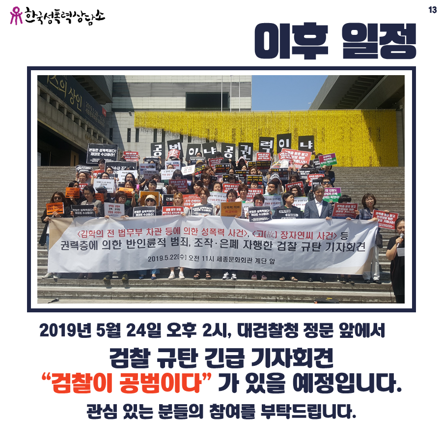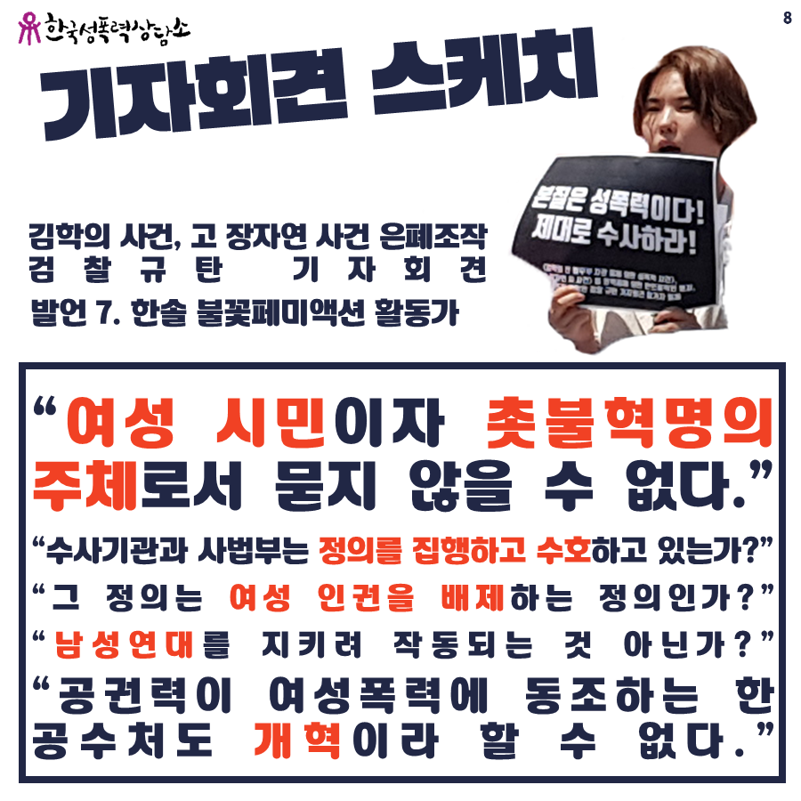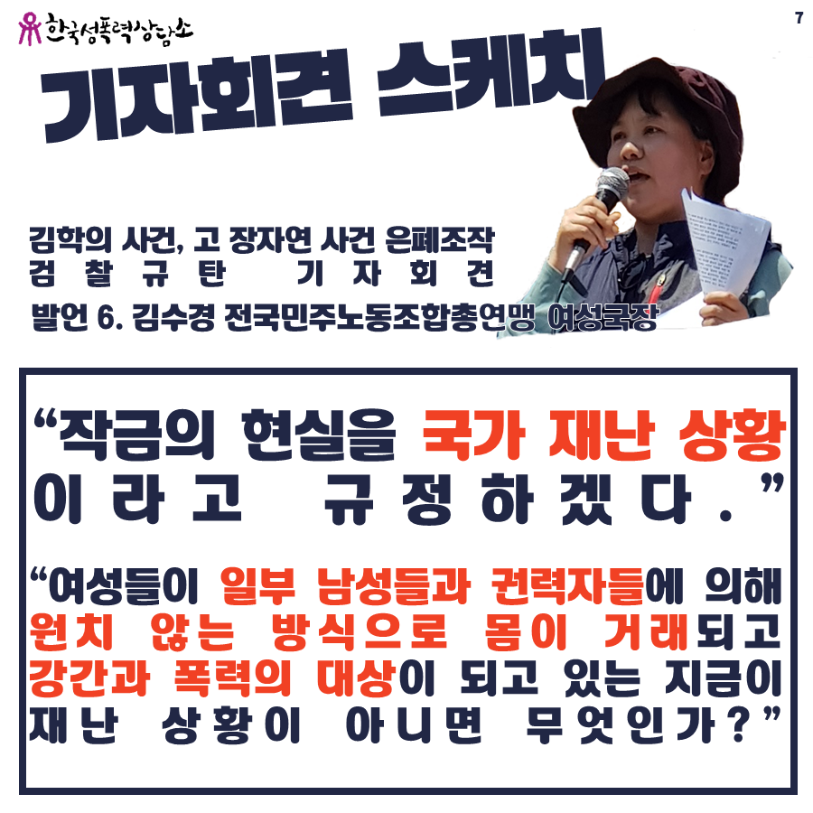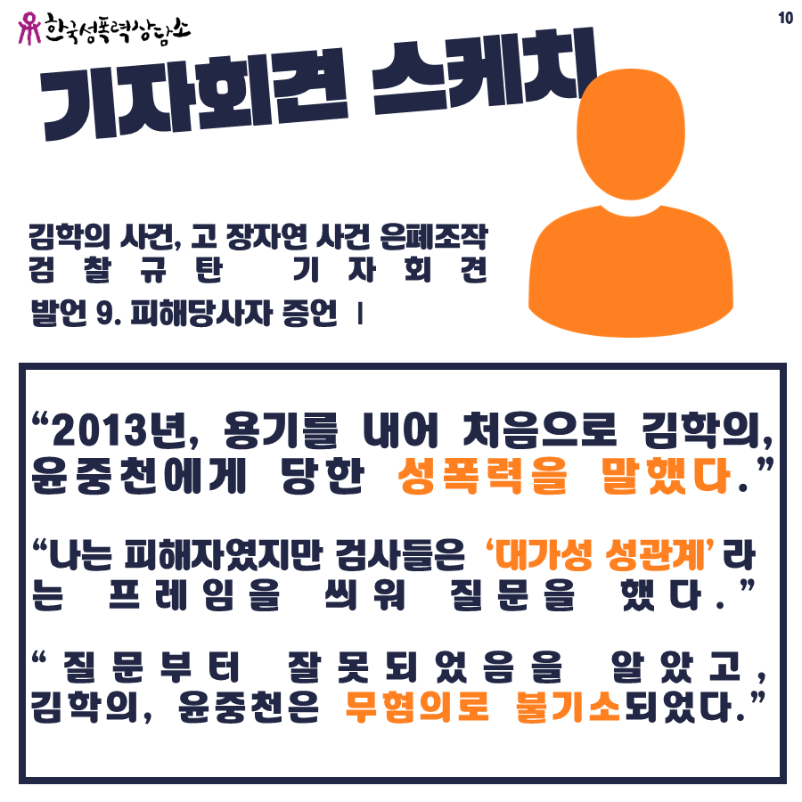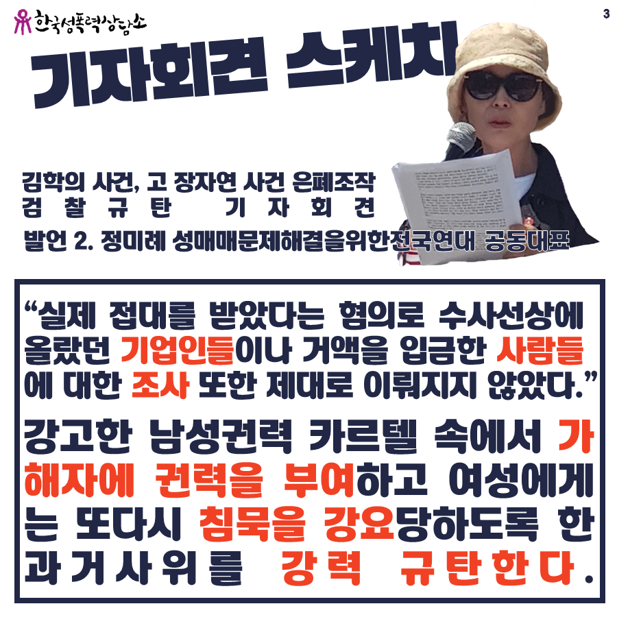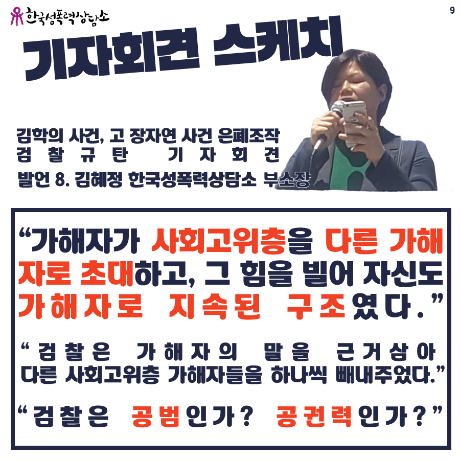 지난 5월 22일, 세종문화회관 앞 계단에서 <김학의 전 법무부차관 등에 의한 성폭력사건>, <고(故) 장자연 씨 사건> 등 권력층에 의한 반인륜적 범죄, 은폐·조작 자행한 검찰 규탄 기자회견이 있었습니다. 1시간 반 정도 진행된 기자회견인만큼 발언자도 많은 기자회견이었는데요, 발언자 11명의 핵심발언을 요약해 보았습니다. 함께 보실까요?