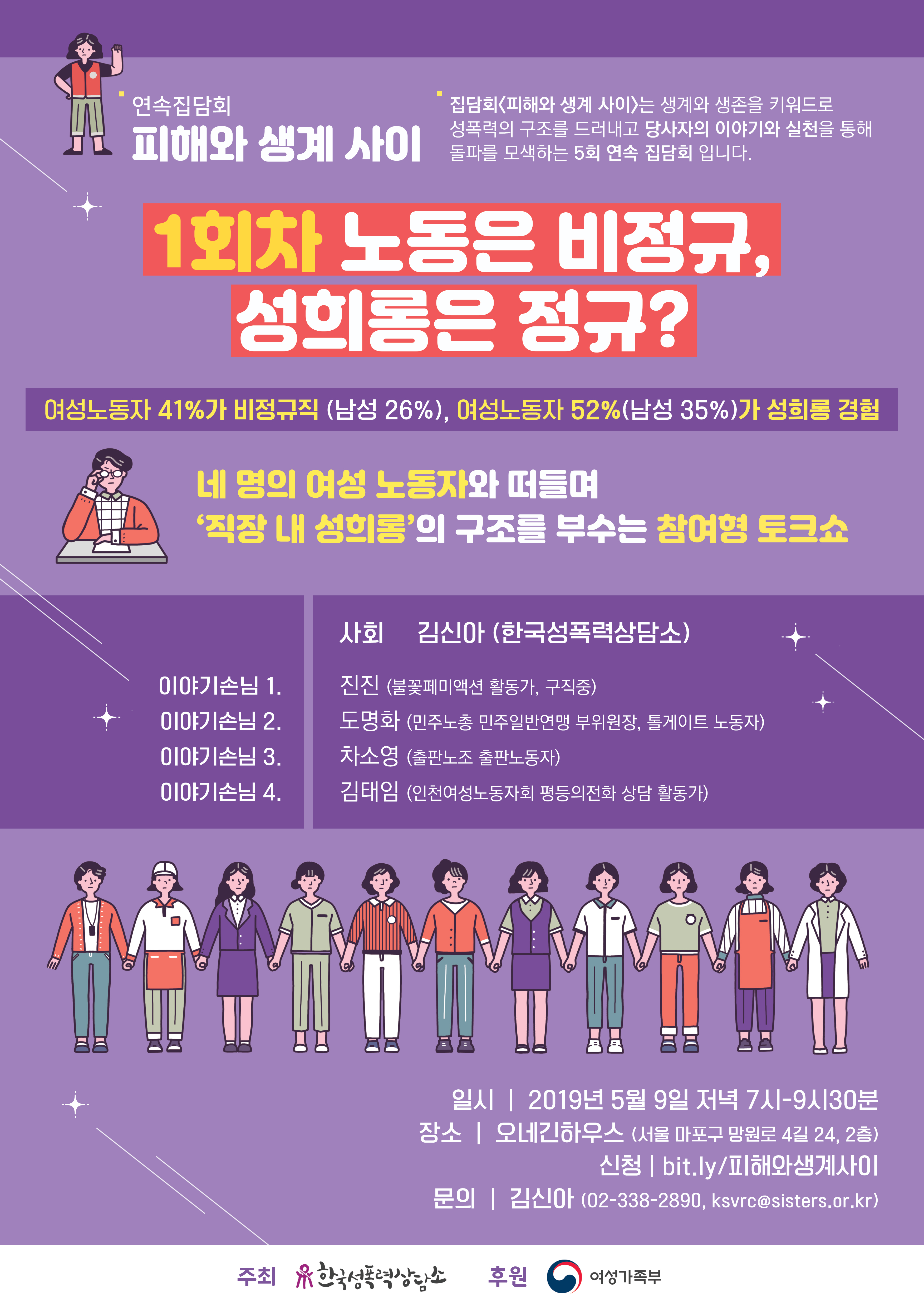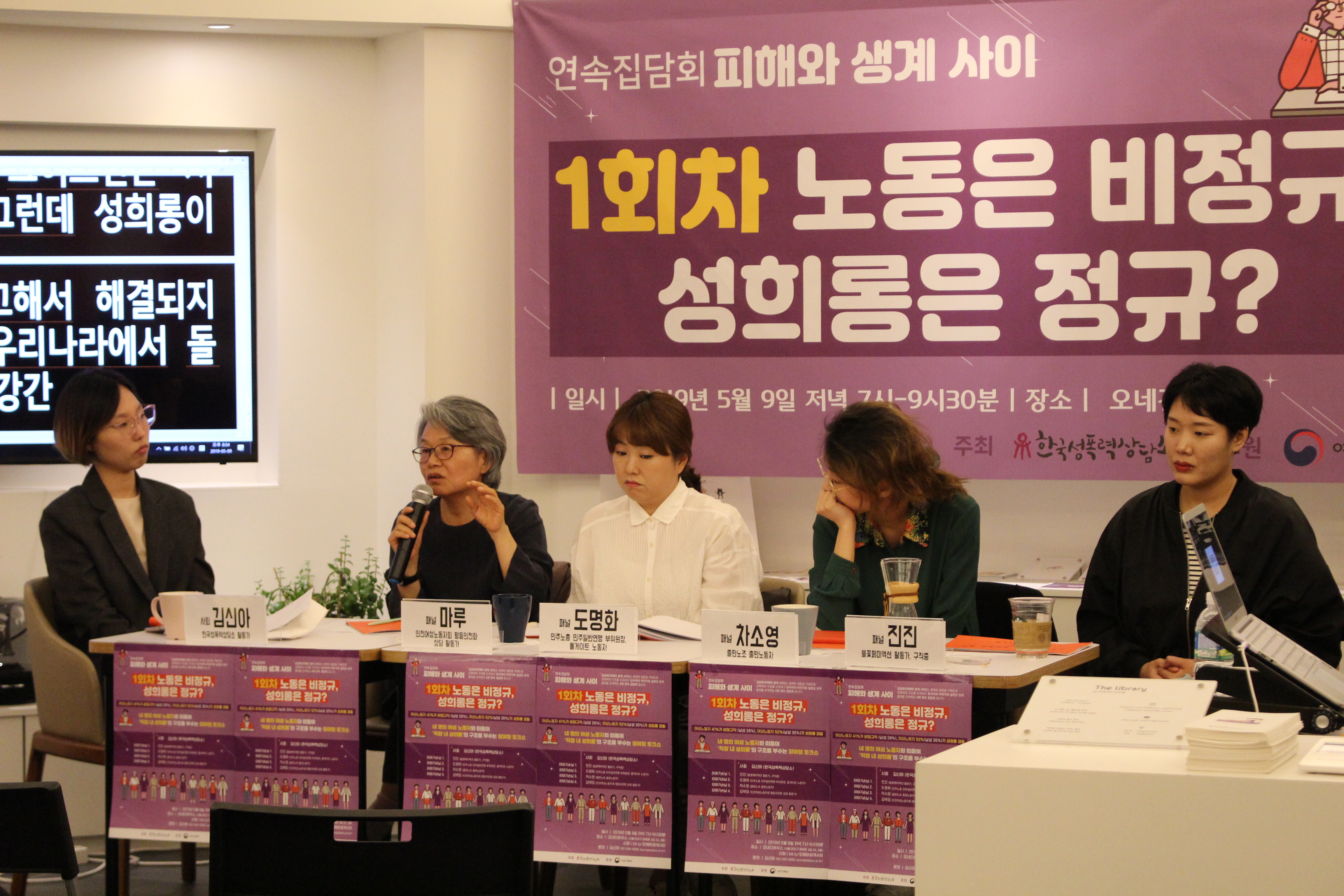 여튼 본문으로 들어가서, 5월 9일 목요일 오후 7시, 「피해와 생계 사이」 연속 집담회 1회 <노동은 비정규, 성희롱은 정규?>가 서울 망원동에 위치한 오네긴하우스에서 시작되었습니다.