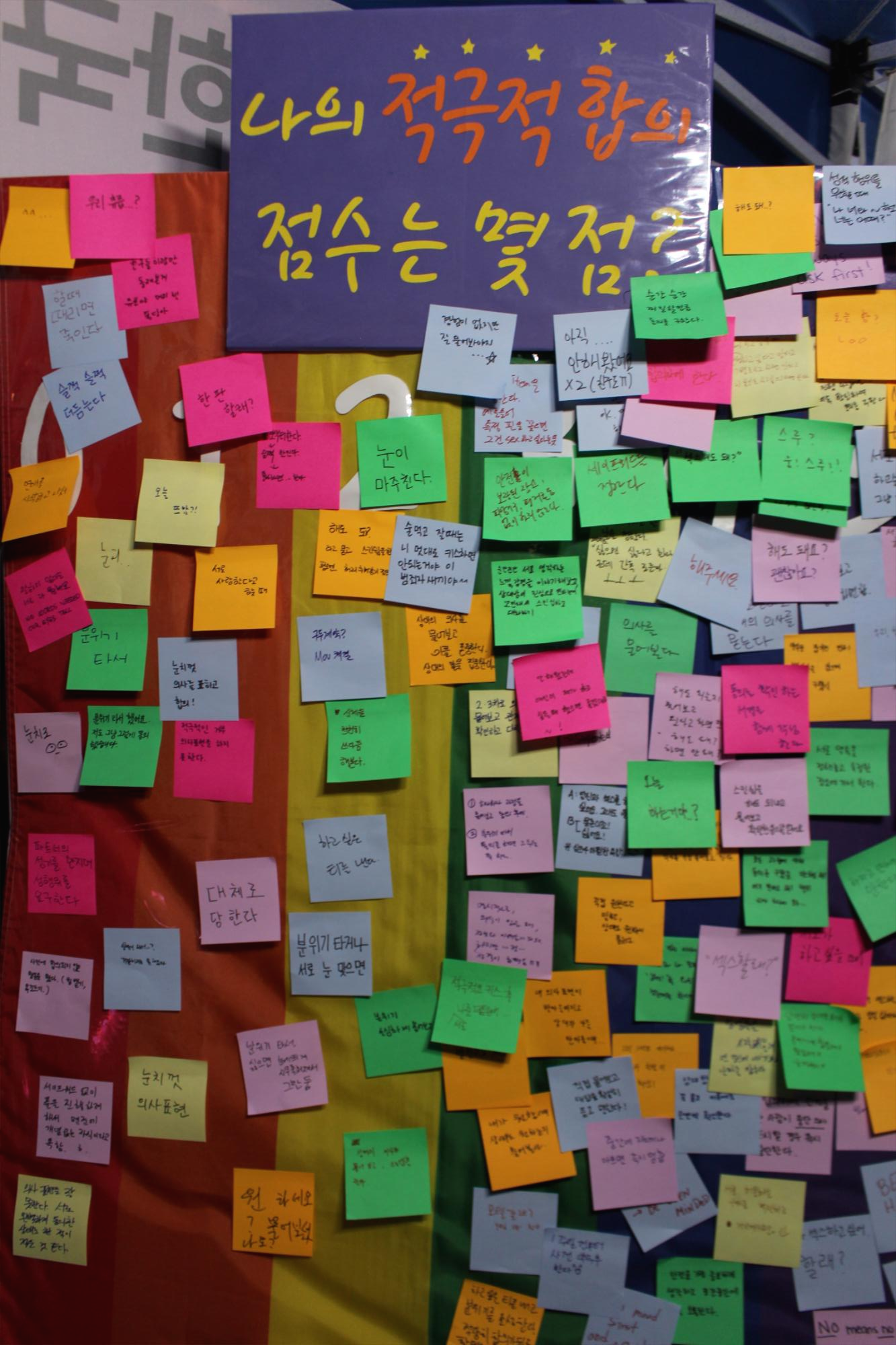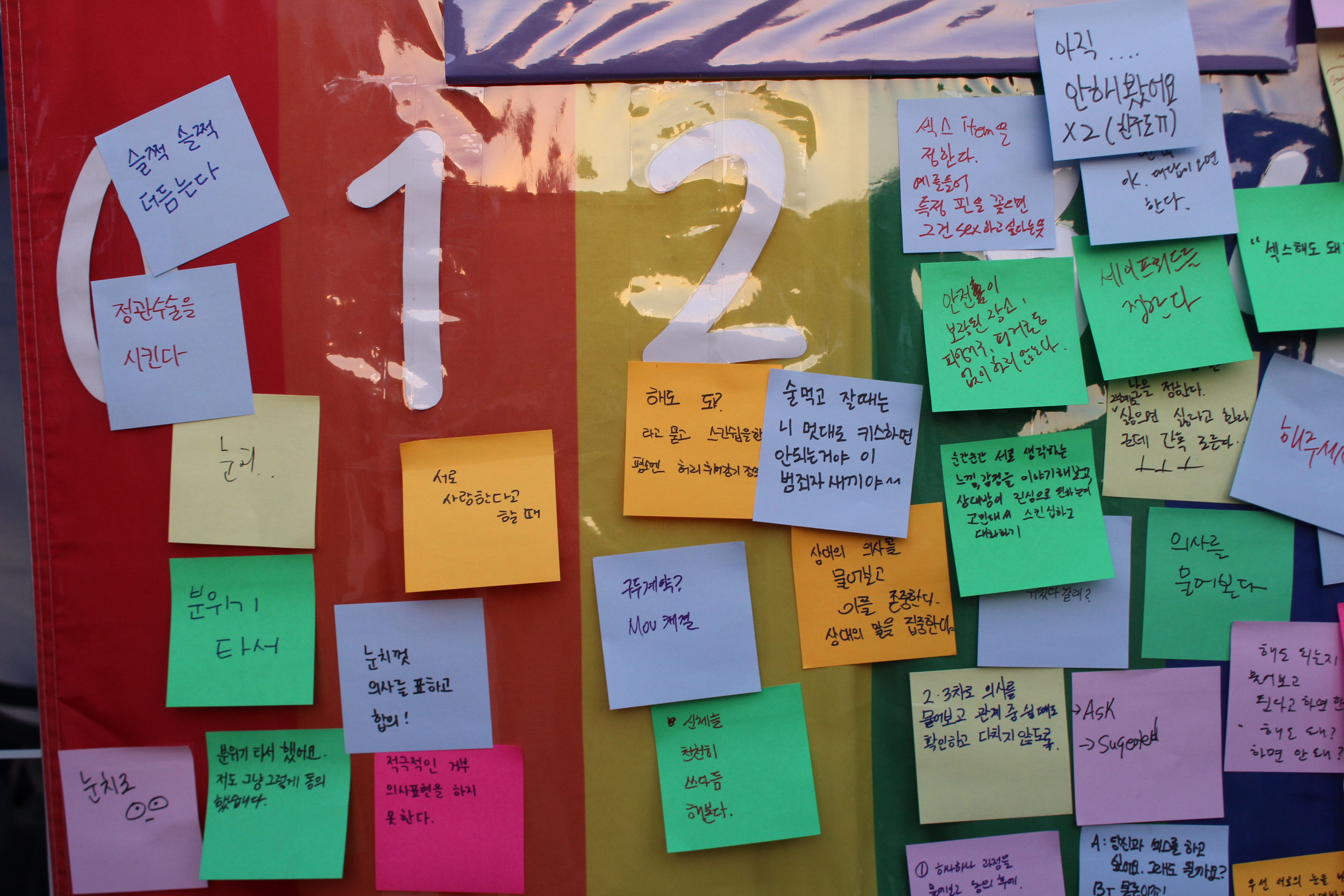 그런 다양한 참여자들의 반응에서 특히 인상 깊었던 기억이 몇 개 있다. 그중 하나는 두 명의 참여자가 와서 어떤 한 포스트잇을 보고서는 이 행동은 몇 점에 있어야 하는가를 서로 열띠게 얘기했던 것이었다. 아무래도 일상에서는 성에 대해서 자유롭게 얘기할 수 있는 장소도 없을 뿐만 아니라 친구들끼리는 이런 얘기를 나누더라도 장난식으로 흘러가기가 쉬운데 퀴어퍼레이드에서는 성에 관해 얘기하는 것을 매우 자연스럽고도 진지하게 받아들였기에 더욱 특별하게 느껴졌던 것 같다.