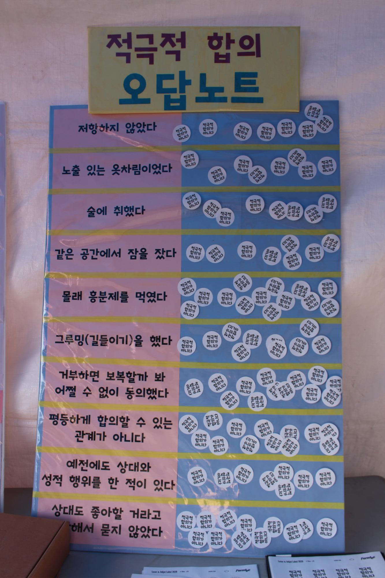 위에서 말한 ‘나의 적극적 합의 점수는 몇 점?’ 활동에서는 다양한 참여자들의 반응을 볼 수 있었다. 포스트잇을 부탁드리면 쑥스러워하시거나 거절하시는 분도 계셨고 오히려 하고 싶다고 부탁하시는 분도 계셨다. 어떤 분은 판넬에 붙여진 포스트잇이 흥미로우셨는지, 포스트잇은 적지 않으셨지만 판넬을 오랫동안 구경하다가 가시기도 했다. 또한, 판넬을 찍어가시는 분도 많았다. 그룹으로 온 참여자의 경우에는 판넬에 붙여진 포스트잇을 보고 서로의 생각을 공유하시는 장면도 많이 보았다.