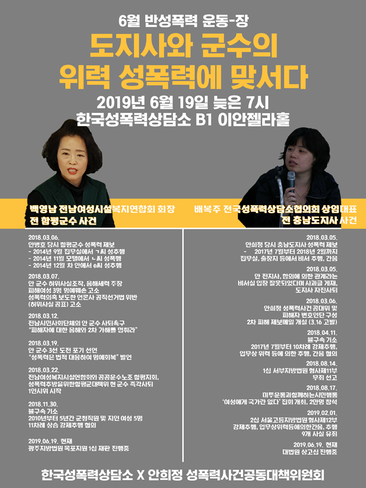 지난 2019년 6월 19일 오후 7시 한국성폭력상담소에서는 반성폭력 운동-장이 열렸습니다. <도지사와 군수의 위력 성폭력에 맞서다>를 주제로 안병호 (당시 함평군수) 사건과 유두석 (현 장성군수) 사건과 함께했던 백영남 전남여성시설복지협의회 대표와 안희정 (당시 충남도지사) 사건과 함께했던 배복주 전국성폭력상담소협의회 상임대표의 이야기를 듣는 시간을 가졌는데요.