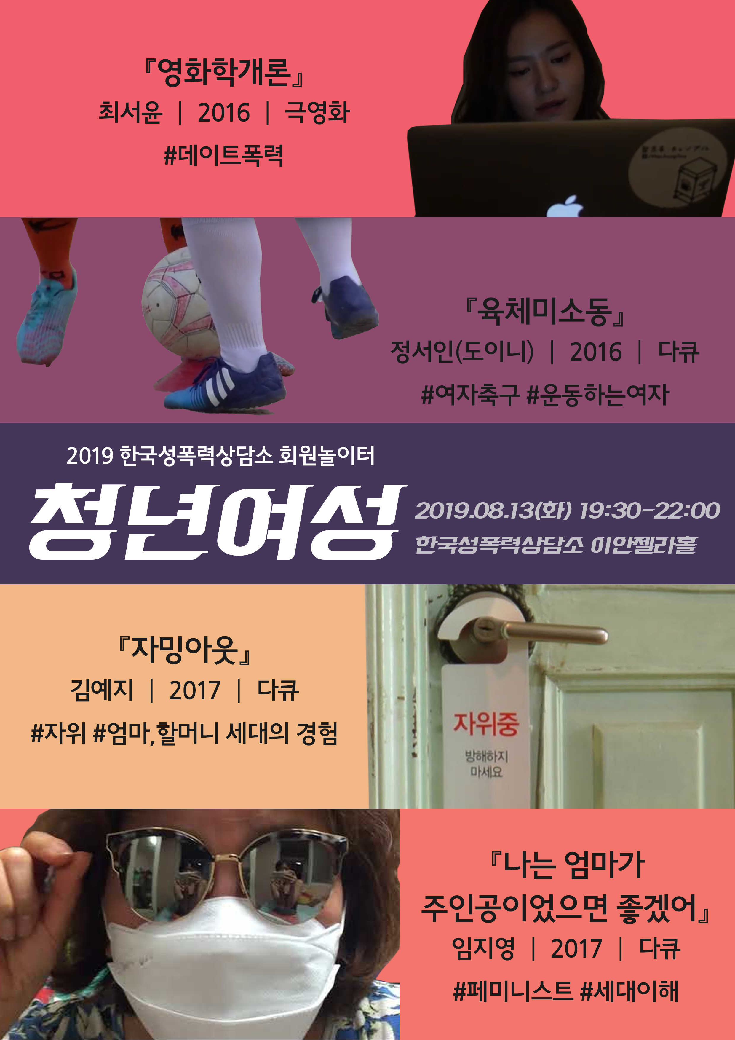 2016-2018년 서울시여성가족재단이 진행한 "청년여성 영상제작 프로젝트"를 통해 완성된 단편영화 중 4편을 선정하여 함께 보고, 오늘날 여성운동으로 활약하고 있는 청년여성 활동가들과 함께 '대한민국에서 청년여성으로 살아가는 이야기'를 나누고자 했습니다.