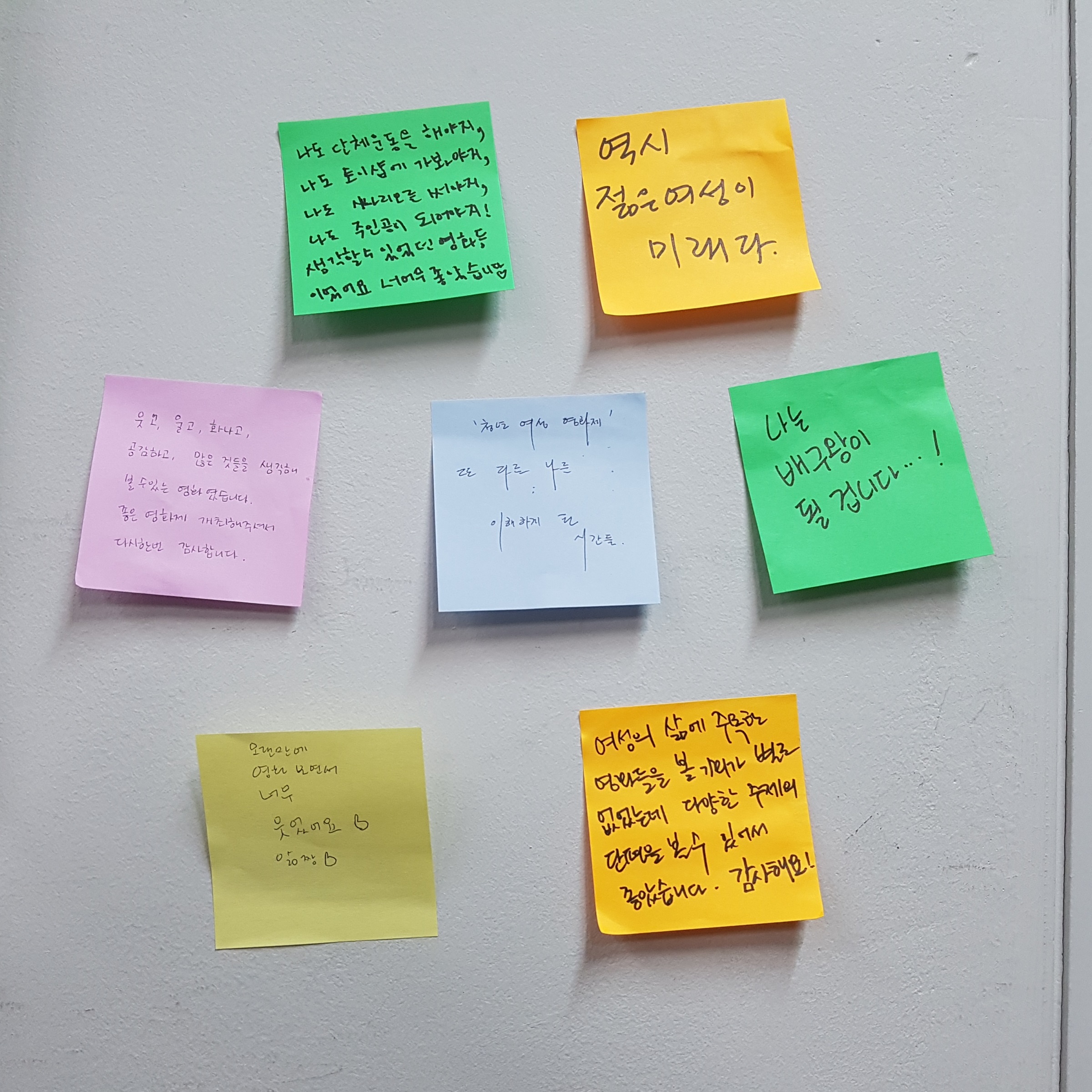 ▷ 여성의 삶에 주목한 영화들을 볼 기회가 별로 없었는데 다양한 주제의 단편을 볼 수 있어서 좋았습니다. 감사해요! ▷ 웃고, 울고, 화나고, 공감하고, 많은 것들을 생각해 볼 수 있는 영화였습니다. 좋은 영화제 개최해주셔서 다시 한 번 감사합니다.