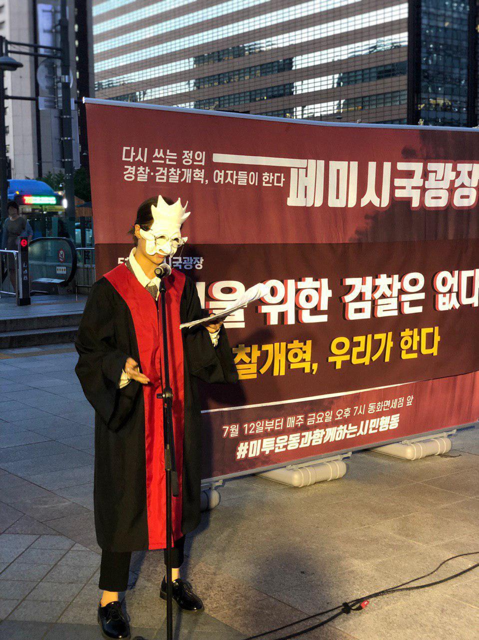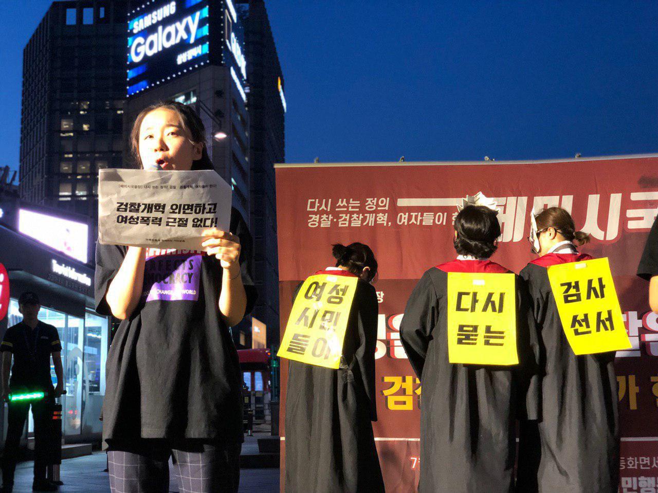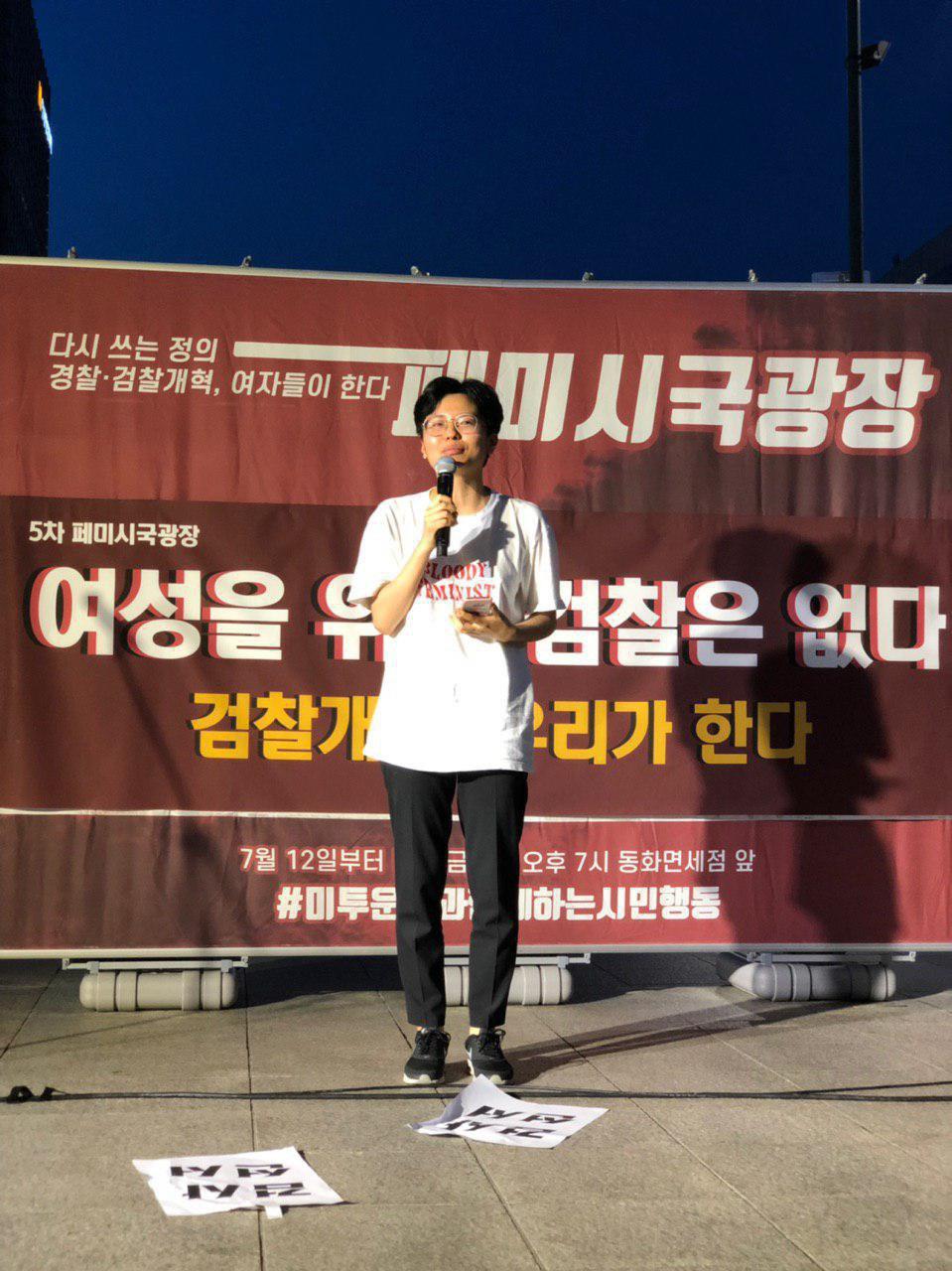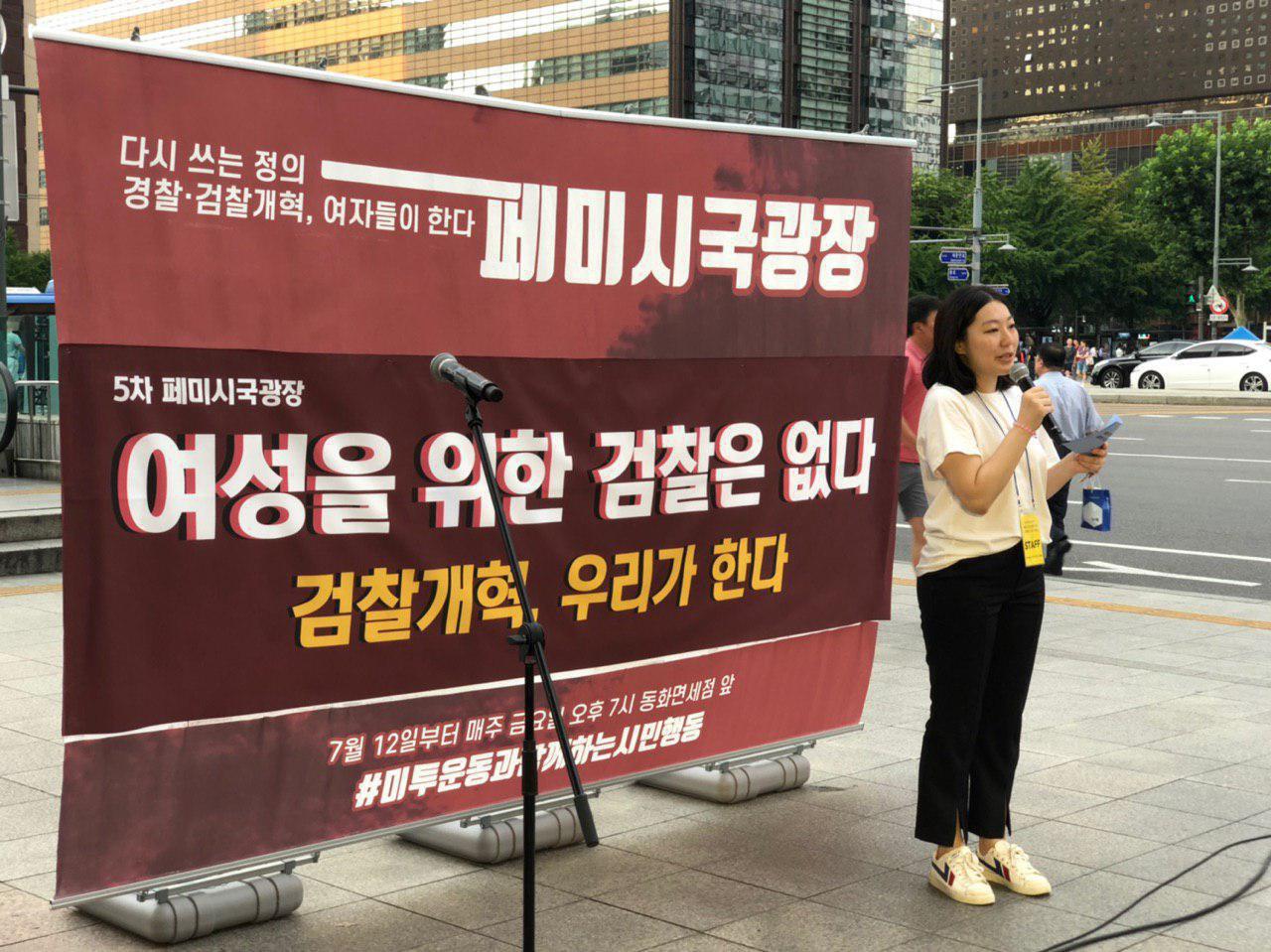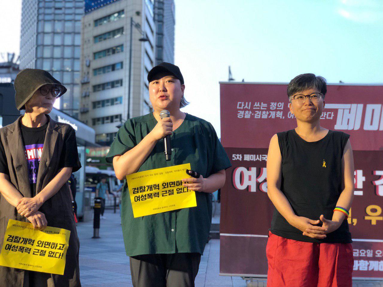 이번 집회에서는 장학썬 사건, 그리고 양진호 사건에 대한 경찰과 검찰의 책임을 물어왔던 지난 1-4차 페미시국광장에 잇따라 검찰의 성폭력 사건 불기소 문제를 규탄하고 검찰개혁을 촉구하는 목소리가 이어졌습니다.