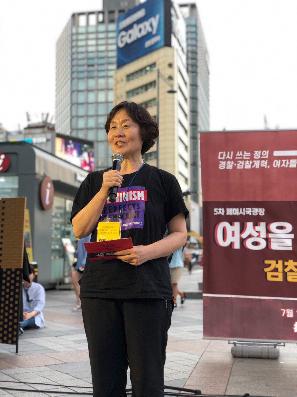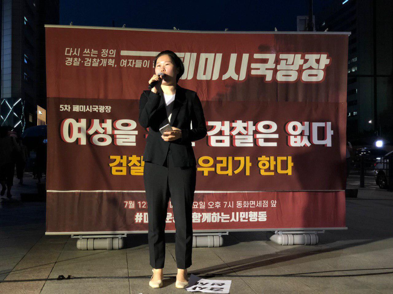 5차 페미시국광장은 한국성폭력상담소 이미경 소장의 발언으로 시작되었습니다. 한국성폭력상담소 이미경 소장은 "‘범죄로부터 국민의 생명과 건강을 보호하고 국민의 안전을 보장하겠다는 검찰’이 오히려 정의를 왜곡하고, 피해자의 인권을 침해하며 2차적인 피해를 주고 있다"고 비판하였는데요, 그래도 검찰개혁이 그렇게 절망적이지만은 않다고 했습니다. “정의를 구현하고자 노력하는 검사 또한 많이 있음을 안다. 다들 꺼려한다는 성폭력전담검사를 사명감을 갖고 자청해서 15년 넘게 성인지감수성으로 수사업무를 하는 검사도 있다”며 “나는 반성폭력운동가로서 그동안 법무부와 검찰청과의 거버넌스에 참여한 경험을 통해 검찰개혁의 가능성을 봐왔다”고 말했습니다.