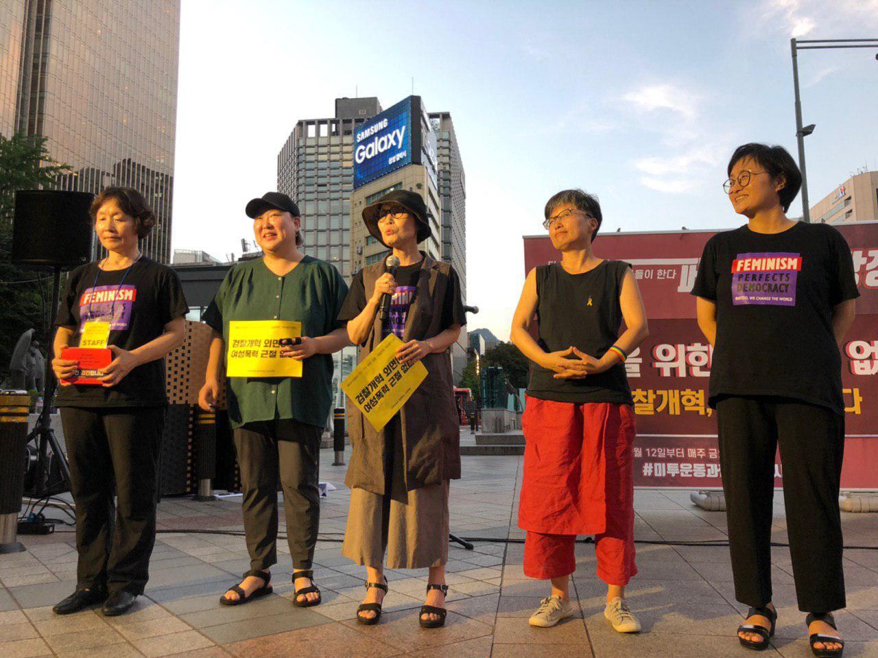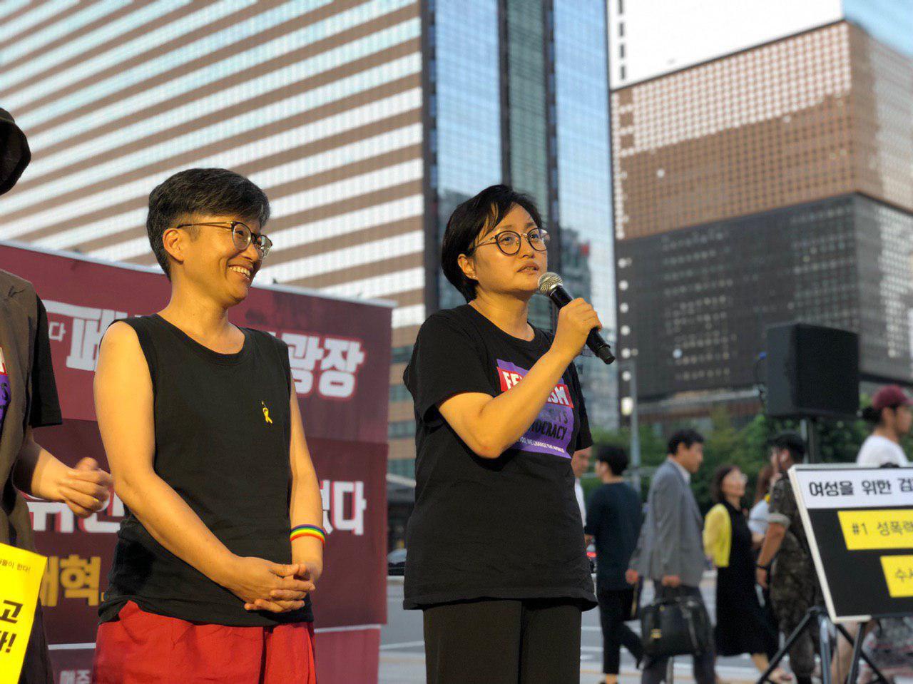 이미경 소장의 발언이 끝난 후에는 4명의 활동가가 무대로 나와 연대 발언을 하였는데요, 이들은 지난 5월 24일, 대검찰청 기습점거 농성을 한 한국여성의전화 고미경 대표, 성매매문제해결을위한전국연대 정미례 대표, 수원여성회 조영숙 대표, 그리고 한국사이버성폭력대응센터 이효린 활동가입니다.