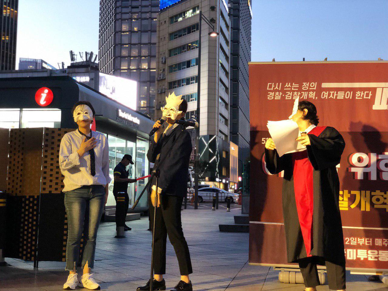 이 구호를 함께 외치고 연극 퍼포먼스가 이어졌습니다.