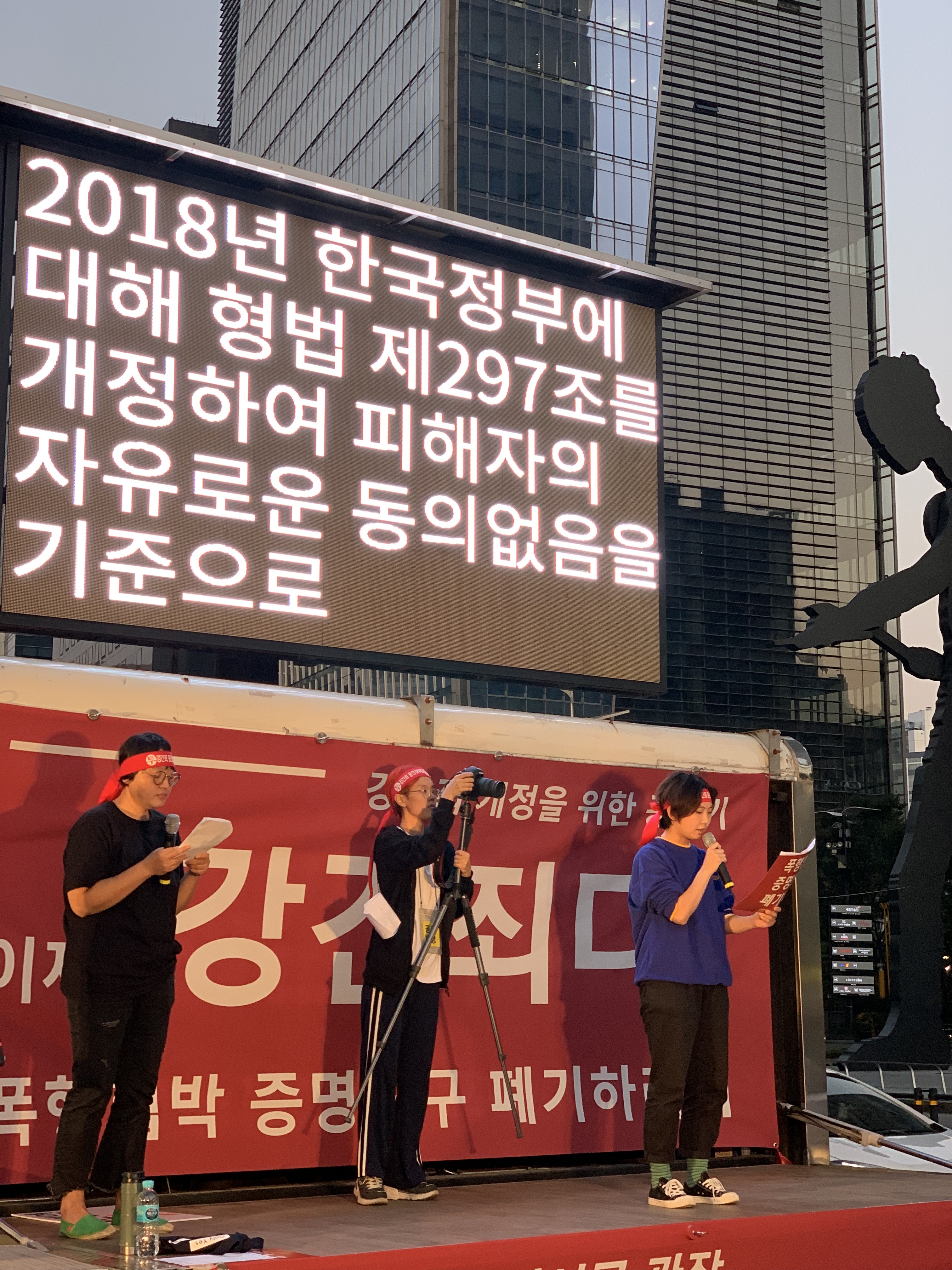 안녕하세요, 저는 한국여성의전화 여성인권상담소 활동가 도경은입니다. 저는 오늘, 총 208개 여성단체가 함께 하는 ’강간죄‘ 개정을 위한 연대회의의 일원으로 이 자리에 섰습니다. ’폭행·협박‘이 있어야만 ’강간죄‘라는 법의 ’엄격한‘ 기준, 아니 대단한 착각이 성폭력 피해자들의 목소리를 외면하고, 피해자들을 고통으로 몰아넣고 있는 현실에 대해 이야기해보려 합니다.