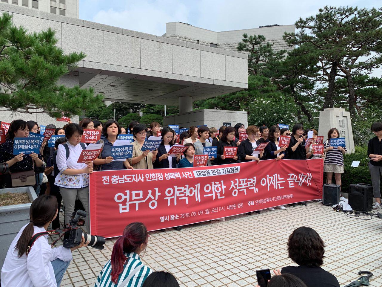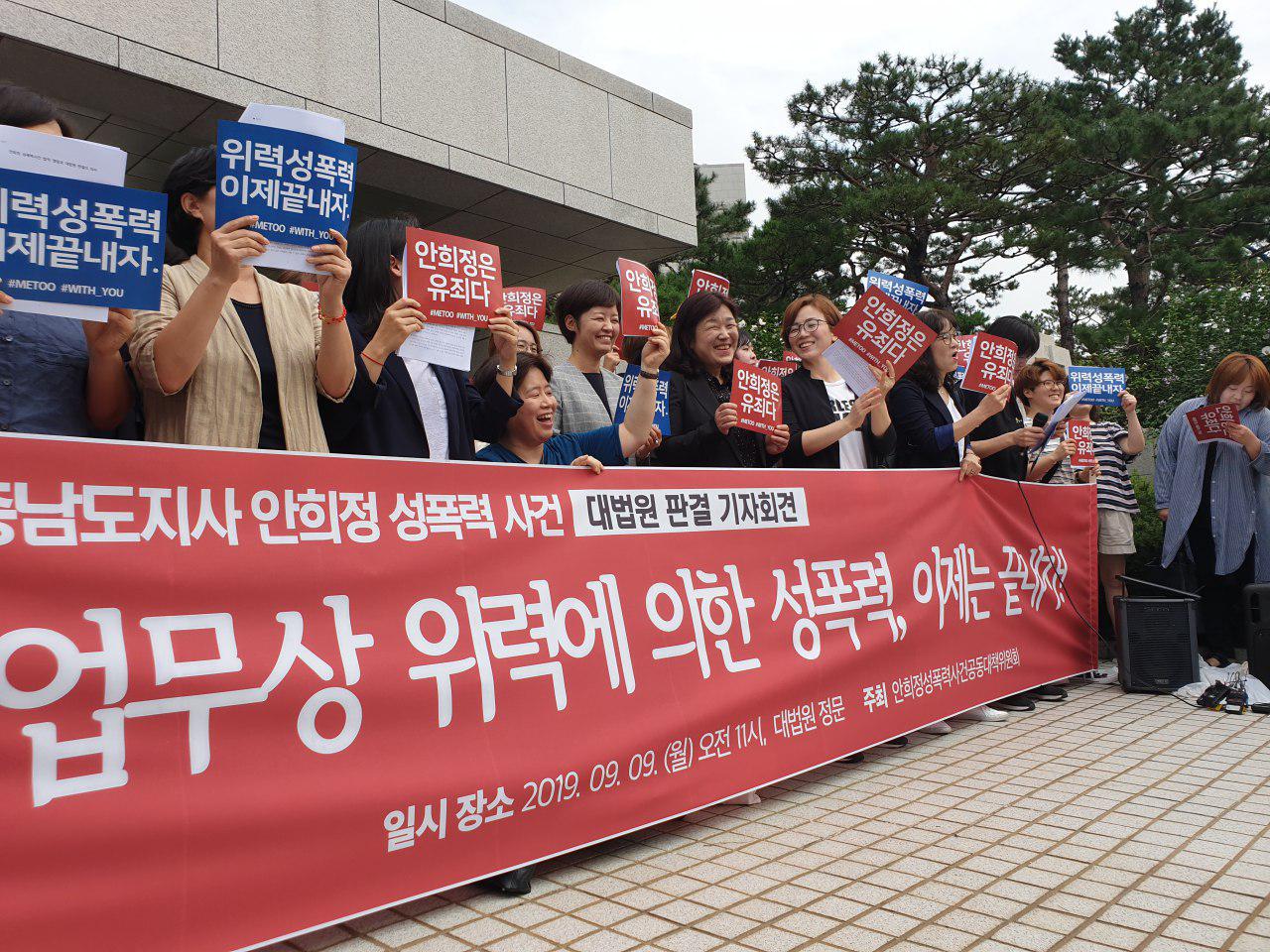 2019년 9월 9일 10시 10분 대법원에서는 '안희정 전 충남도지사에 의한 강제추행, 업무상 위력 등에 의한 간음, 추행' 에 대해 3년 6개월과 40시간 교육 명령, 관련 기관 취업 제한을 내린 서울고등법원 2심의 원심 판결에 법리상 오류가 없어 상고를 기각한다고 결정했습니다. 이로서, 유죄가 확정되었으며, 오랜 시간동안 싸워온 형사 사건이 마무리되었습니다.