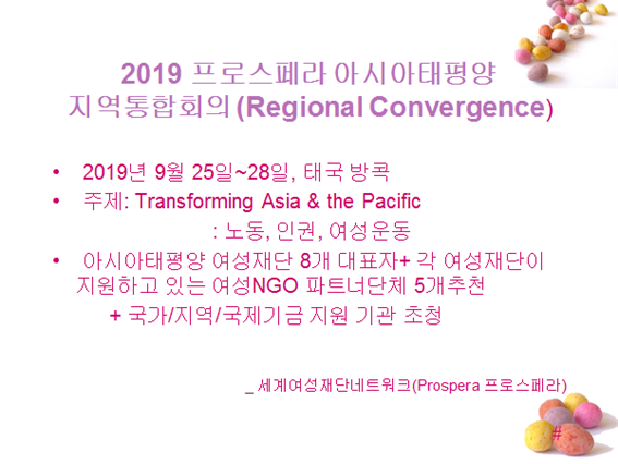 프로스페라(Prospera)는 전세계 38개국 여성재단들이 회원으로 가입되어 있는세계여성재단네트워크다. 아시아태평양 지역통합회의(Regional Convergence)는 올해 처음으로 마련된, 프로스페라의 회원단체들인 재단들 뿐 아니라 아시아 태평양 지역의 각 노동,인권,여성운동와 관련한 단체들이 직접 참여하여 서로가 처한 현실과 상황 등에 대한 어려움이나 필요성 등을 함께 나누고 교류도 할 수 있는 국제네트워킹의 장이다. 한국성폭력상담소는 프로스페라 회원단체인 한국여성재단으로부터 제안을 받아 참여해보기로 결정했다.
