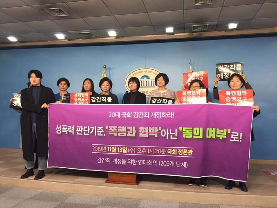 강간죄 개정과 관련하여 이미 지난 2007년, 여성단체와 학자들이 함께 만든 여성인권법연대 주최로 “형법개정안 공청회”가 개최된 바 있습니다. 당시 형법 297조를 “동의 없는 성적행동”으로 두면서 기본구성요건으로 하고, 298조, 299조는 폭행·협박·위력에 대하여 가중 처벌하도록 제안하였지만 개정으로 이어지지는 못했습니다. 그리고 2019년 3월 21일, 전국 209개 단체가 함께(2019.11.13 기준) “‘강간죄’ 개정을 위한 연대회의(이하 연대회의)”를 구성하고, 성폭력의 판단기준을 폭행·협박이 아닌 ‘동의 여부’로 바꾸기 위한 활동들을 해왔습니다. 연대회의의 조사에 따르면 전국성폭력상담소협의회에서 2019년 1월부터 3월까지 접수된 강간 사례 1,030건 중에, 직접적인 폭행·협박이 있었던 사례는 28.6%(295건)에 불과하였고, 직접적인 폭행·협박이 없었던 사례는 71.4%(735건)에 이르렀습니다. 이에 연대회의는 전문가회의를 통해 구체적인 법안을 만들고, 집회, 기자회견, 입장문 제출 등의 활동을 해왔으며, 2019년 11월 13일, 국회 정론관에서 기자회견과 토론회를 개최하였습니다.