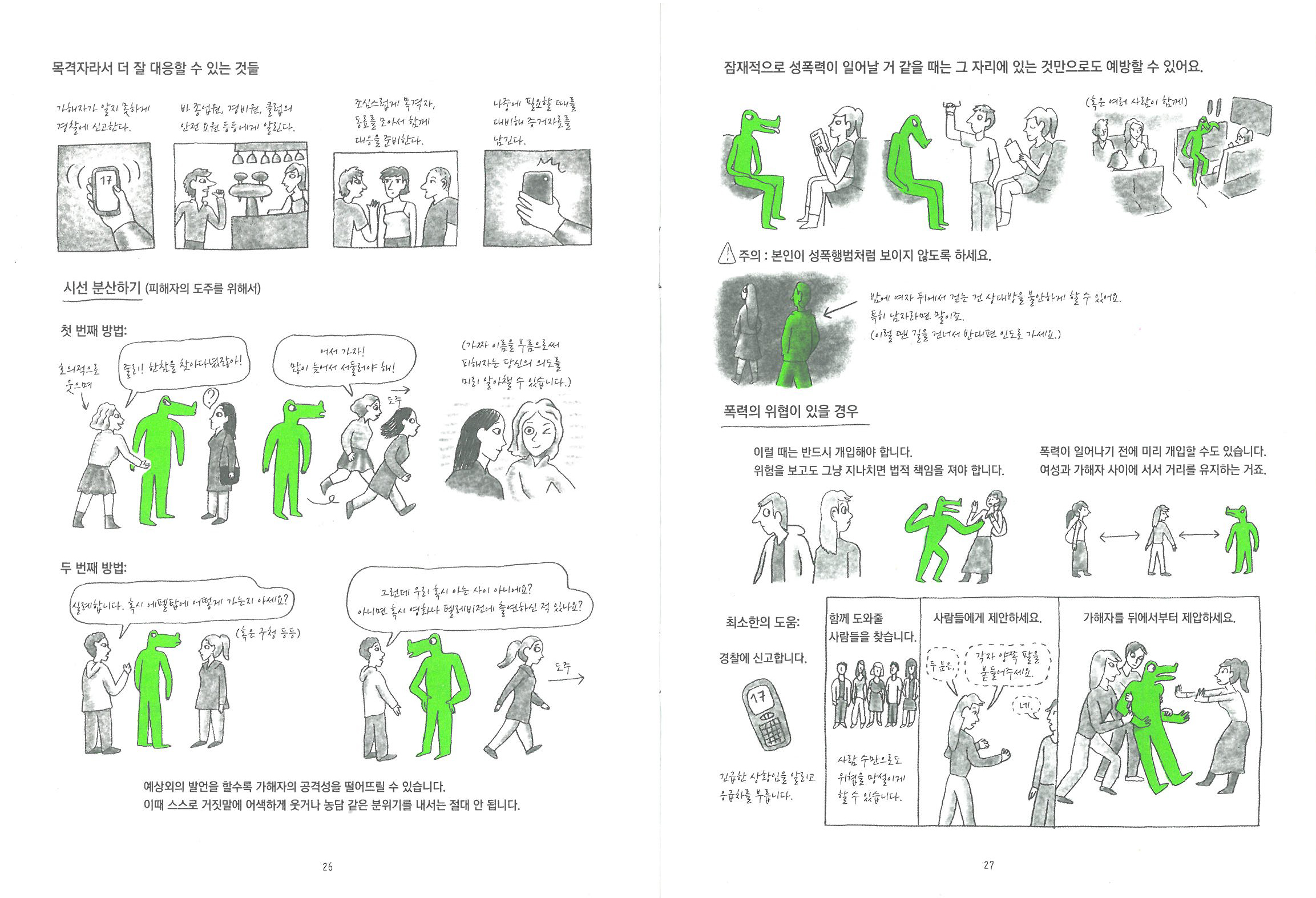 주위에 쳐다보는 사람이나 갑자기 뒤에서 쫓아오는 사람이 있으면 큰길로 나가거나. 아니면 너무 위험하면 소리치거나.