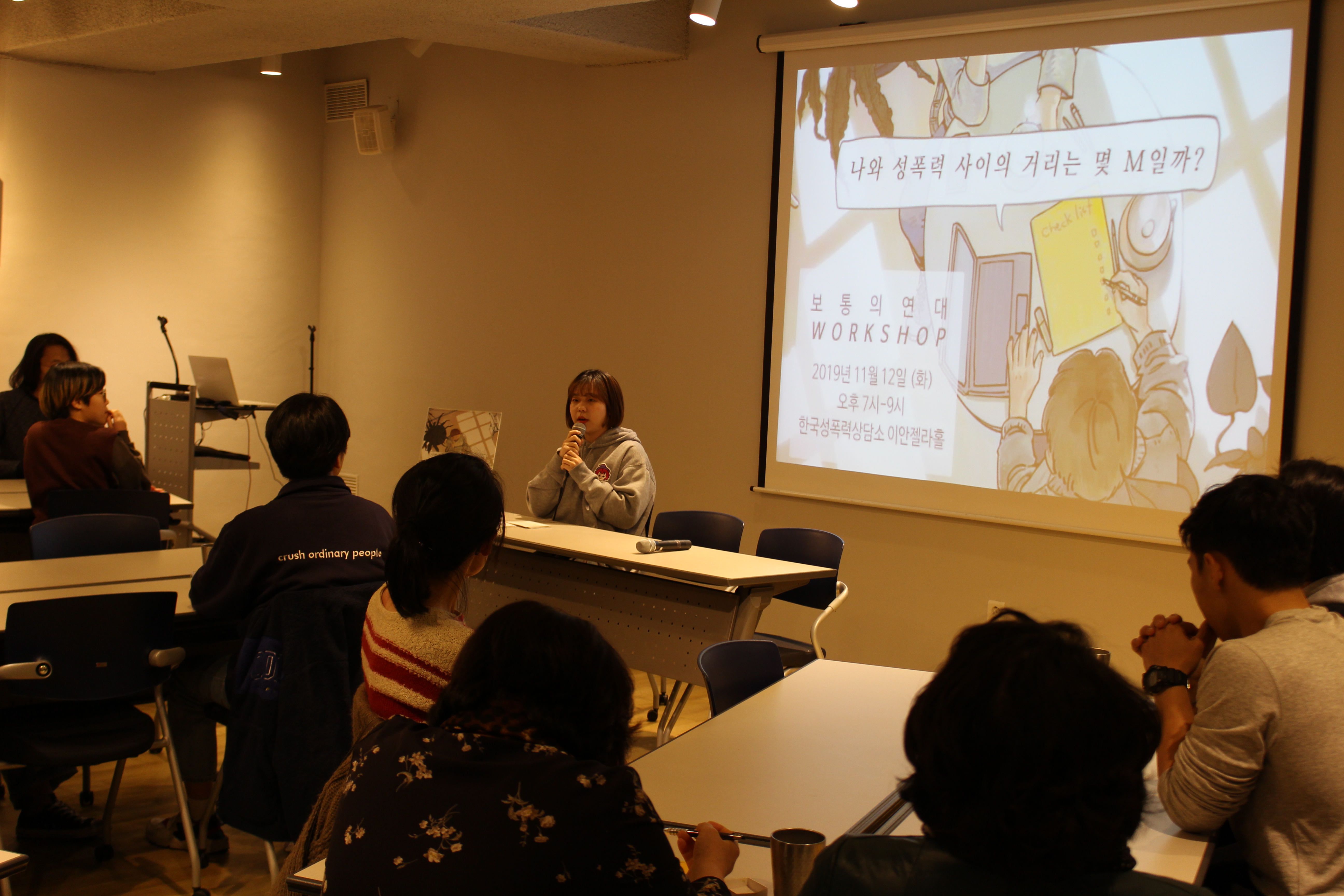 보통의 연대 WORKSHOP <나와 성폭력 사이의 거리는 몇 M일까?>는 2019년 11월 12일(화) 오후 7시-9시 한국성폭력상담소 이안젤라홀에서 진행되었습니다. 성폭력 주변인이라는 낯선 주제 때문에 사람들이 오지 않을까 봐 걱정했는데, 예상보다 많은 분들이 관심 갖고 참여해주셨어요.