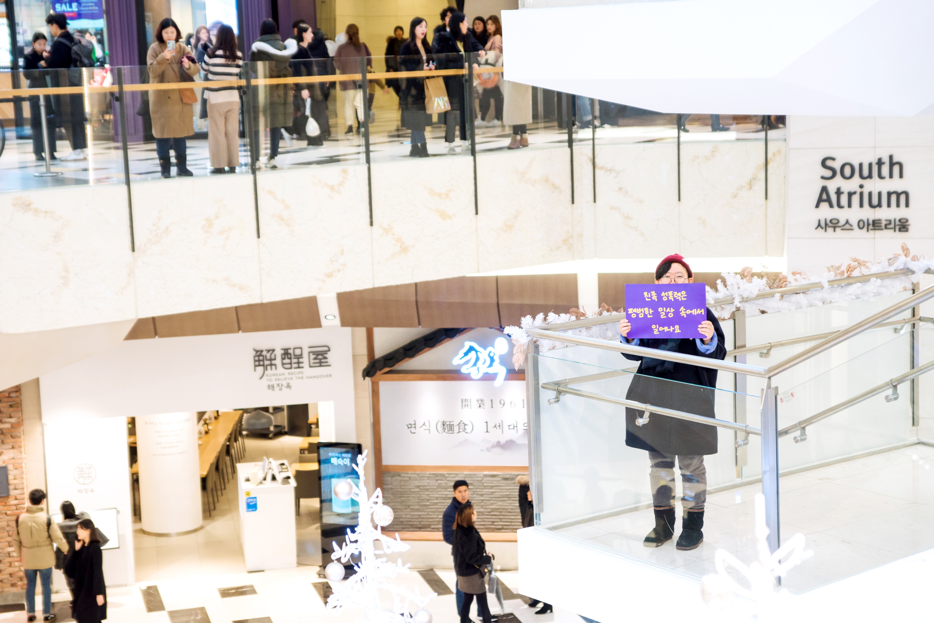 가족 단위 방문객들로 붐비는 여의도 IFC몰에서도 <친족 성폭력 공소시효 폐지부터> 액션은 계속되었습니다. 비록 사전에 계획했던 대로 퍼포먼스를 진행하지는 못했지만, 저마다 흩어져서 일상 공간을 배경으로 친족 성폭력 문제를 알리는 피켓 사진을 찍었습니다.