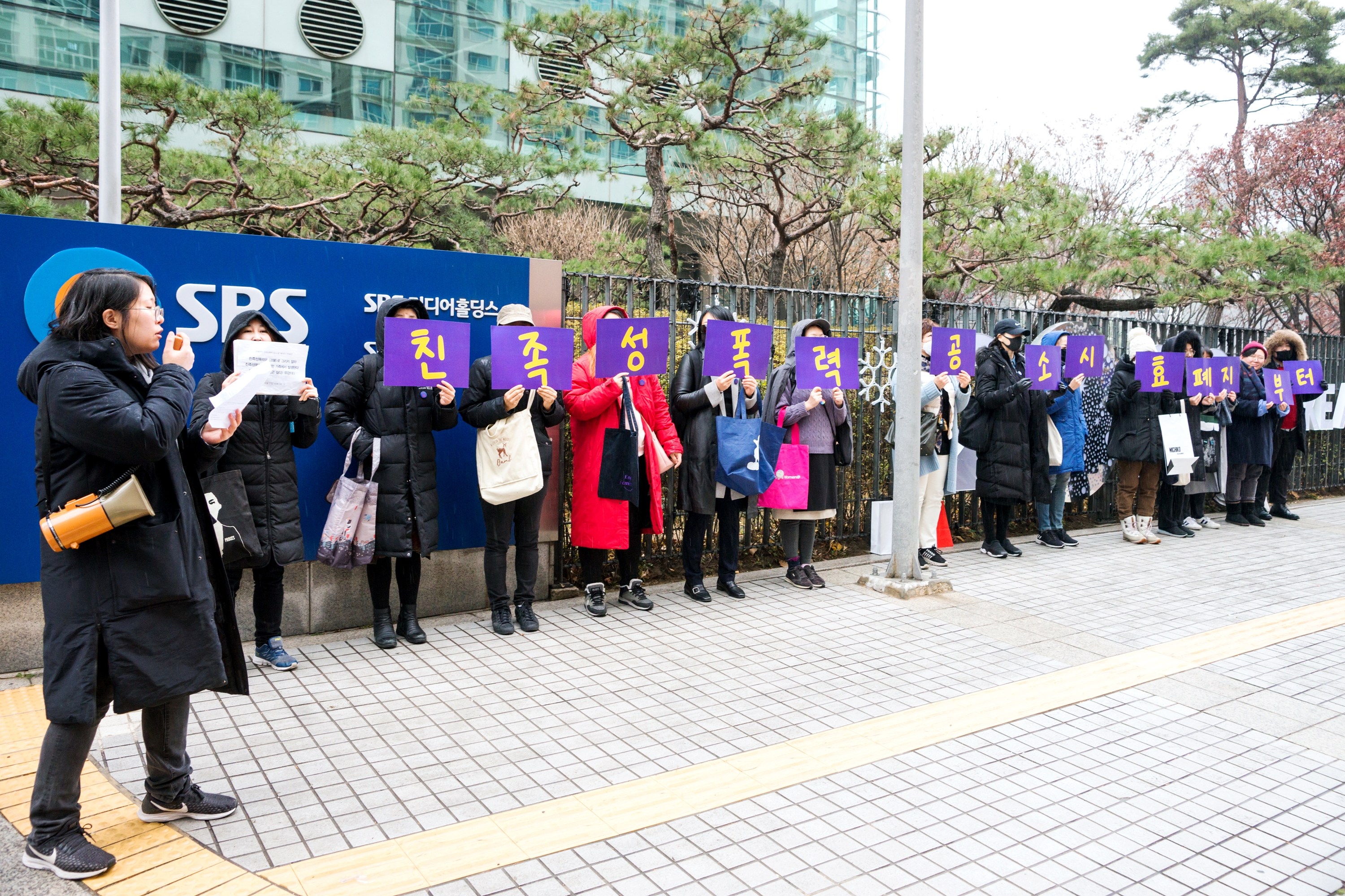 SBS 사옥 앞에서는 진눈깨비를 맞으며 친족 성폭력 공소시효 폐지부터 공폐단단 첫 번째 기자회견 “친족 성폭력을 <괴물>로 그리지 말라 친족 성폭력은 평범한 가족에서 발생한다 SBS <그것이 알고 싶다> 유감이다”를 진행했습니다.
