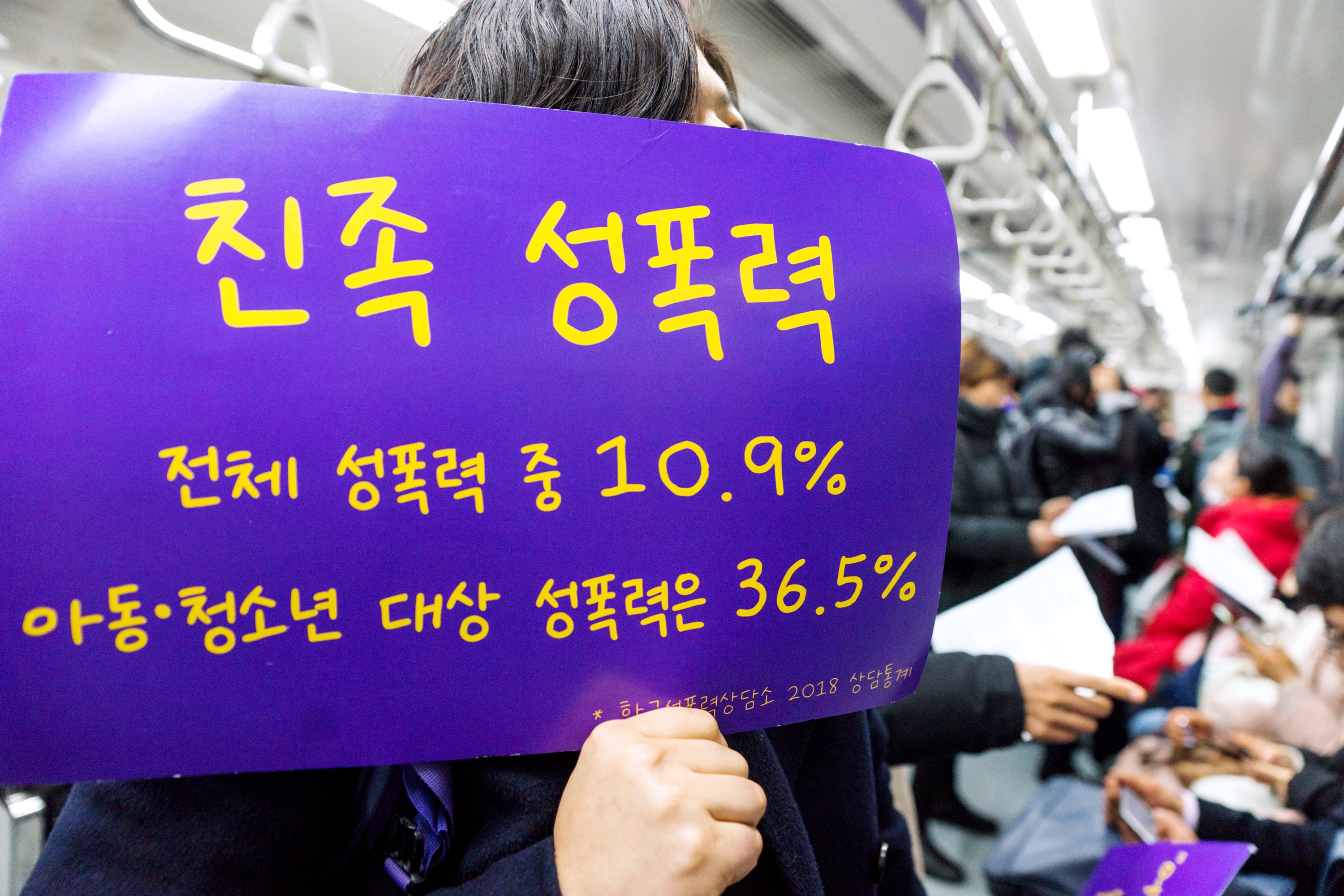 5호선 지하철 안에서는 친족 성폭력의 ‘일상성’과 ‘평범성’을 알리는 퍼포먼스를 진행했습니다. 삼삼오오 평범하게 지하철을 타고 가다가 캠페인단 한 명이 노래를 부르면 다 같이 피켓을 꺼내어 들고 유인물을 나눠주는 퍼포먼스였습니다.